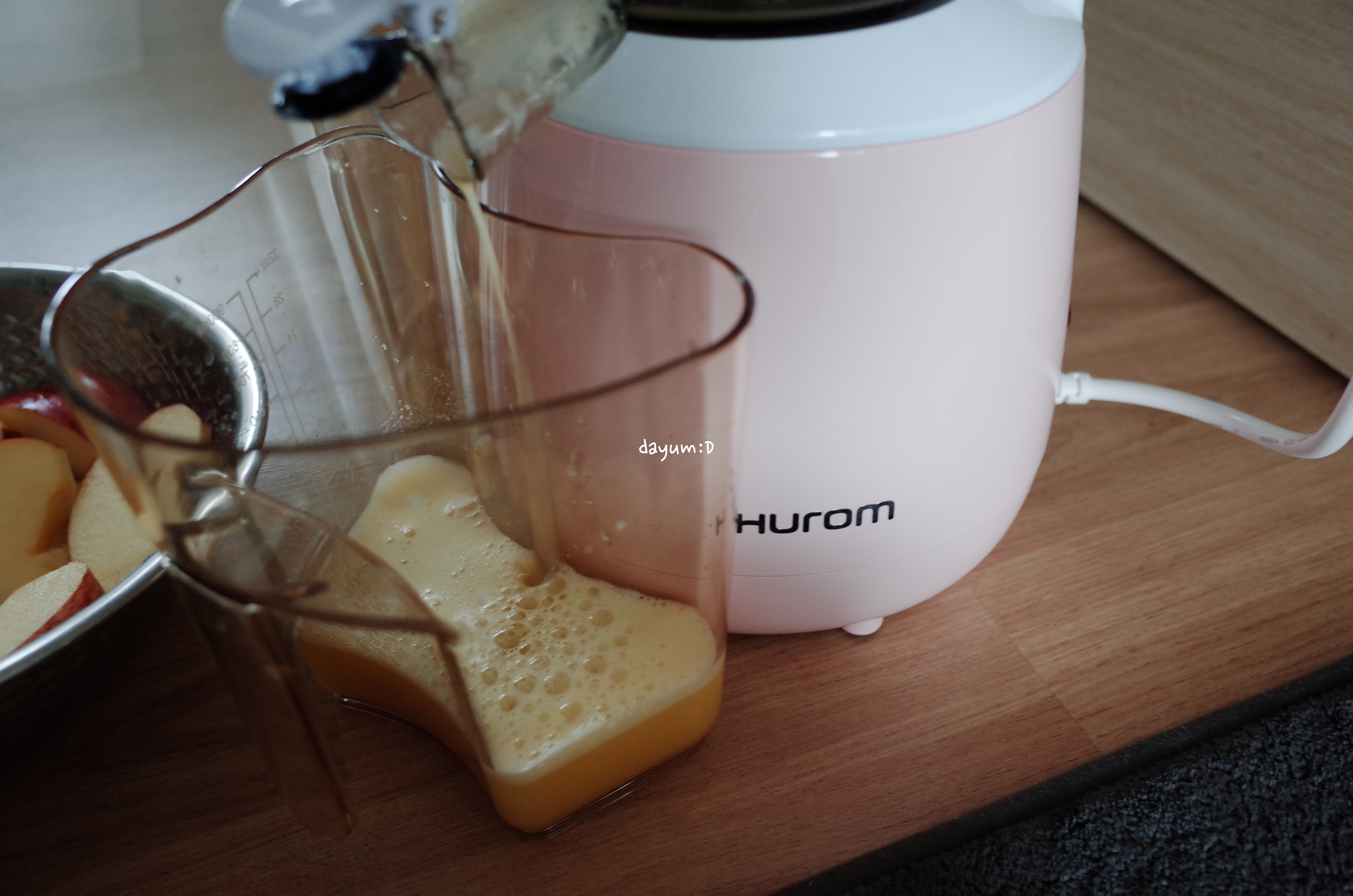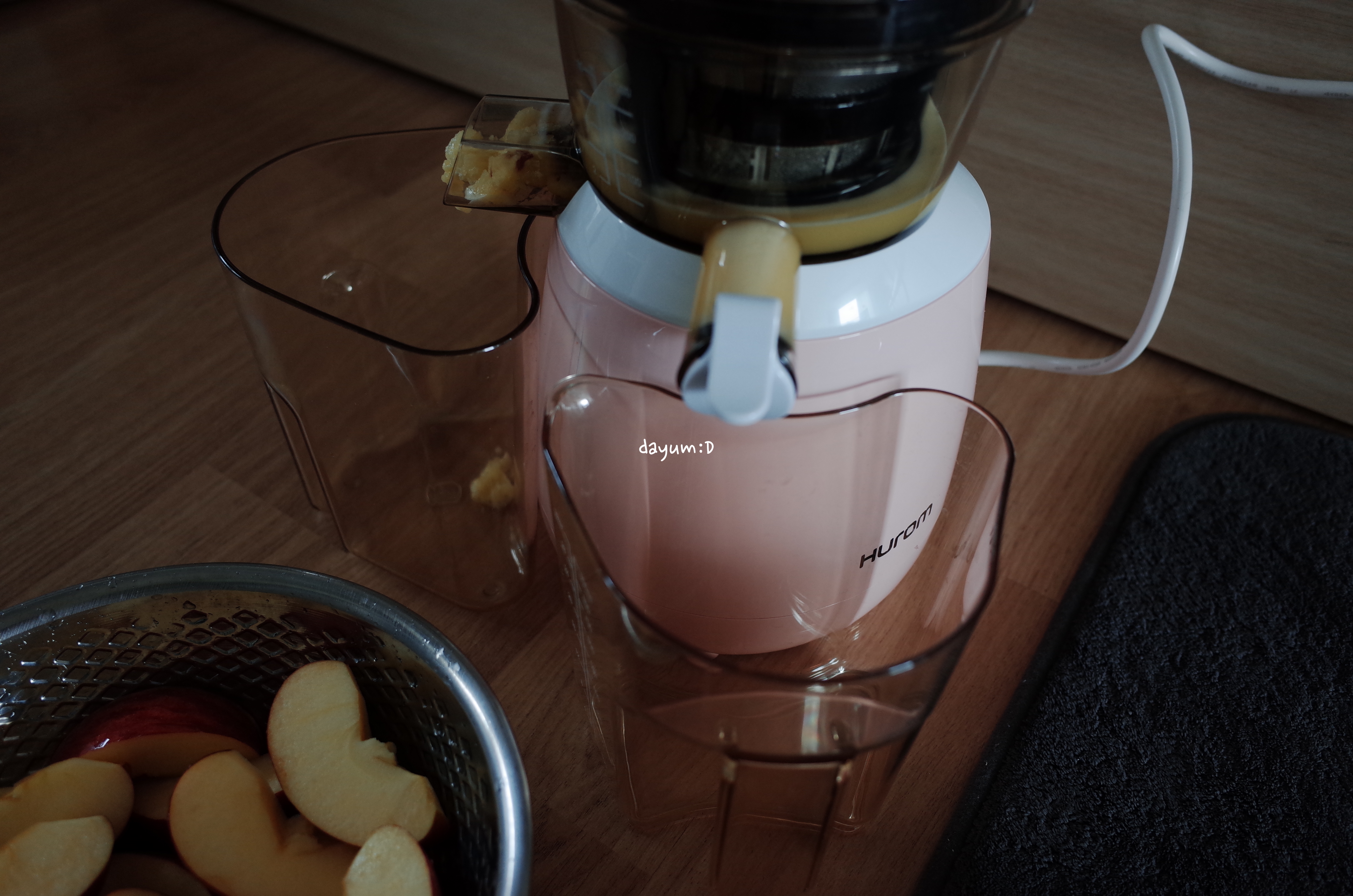 분홍색 쁘띠휴롬으로 일단 사과 세 알을 마구 착즙하여 준다. 그럼, 사과주스 500ml와 사과 찌꺼기가 나온다.