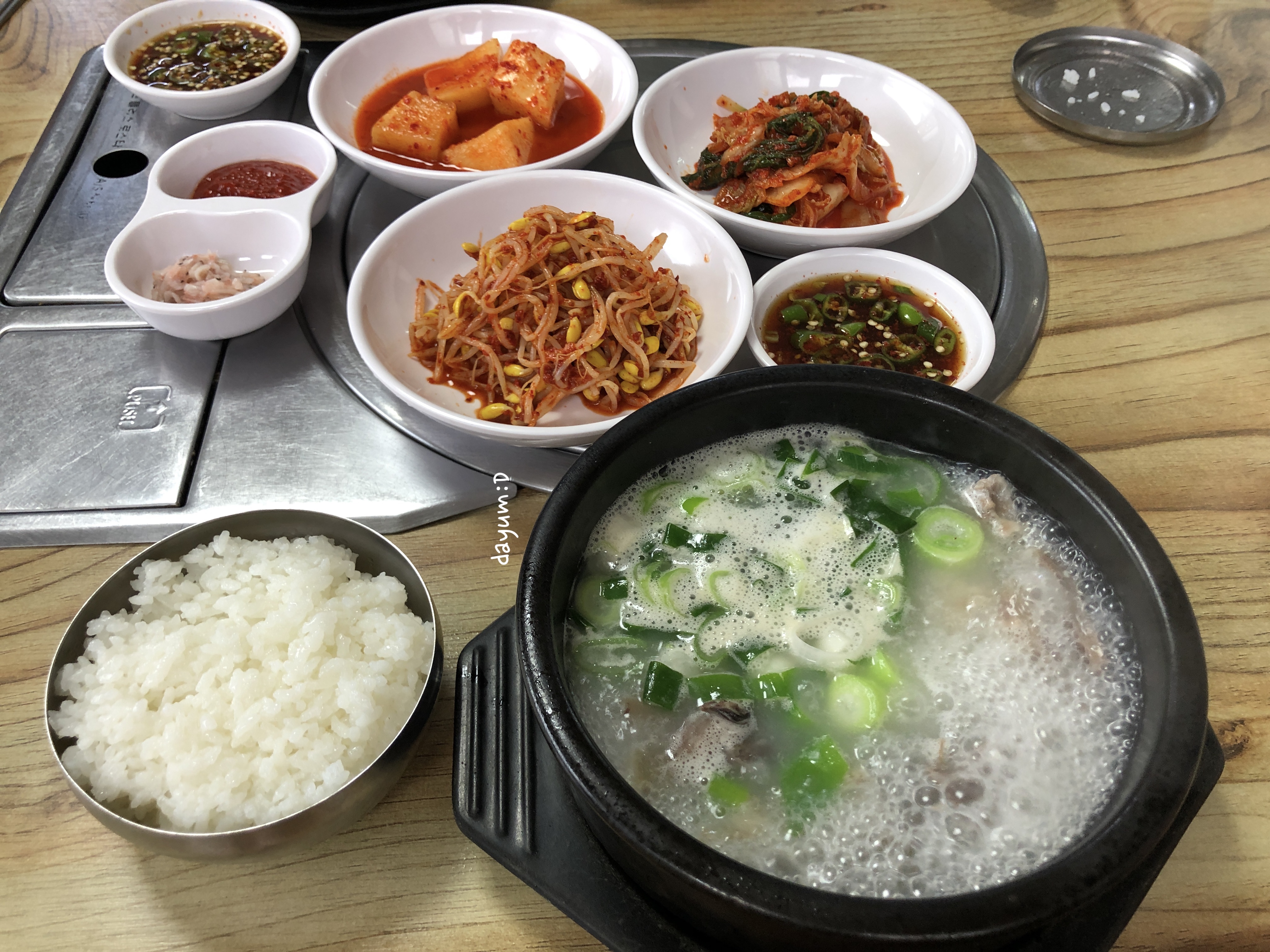 국밥이 나오고 완전히 세팅된 상차림, 고기가 정말 많이 들어있다. 새우젓으로 간을 하고 먹다가 국물이 반정도 남았을때 새우젓옆의 다대기를 넣어서 빨간국물로 만들어서 먹었다. + 깍두기 국물도 넣어서 먹음^-^