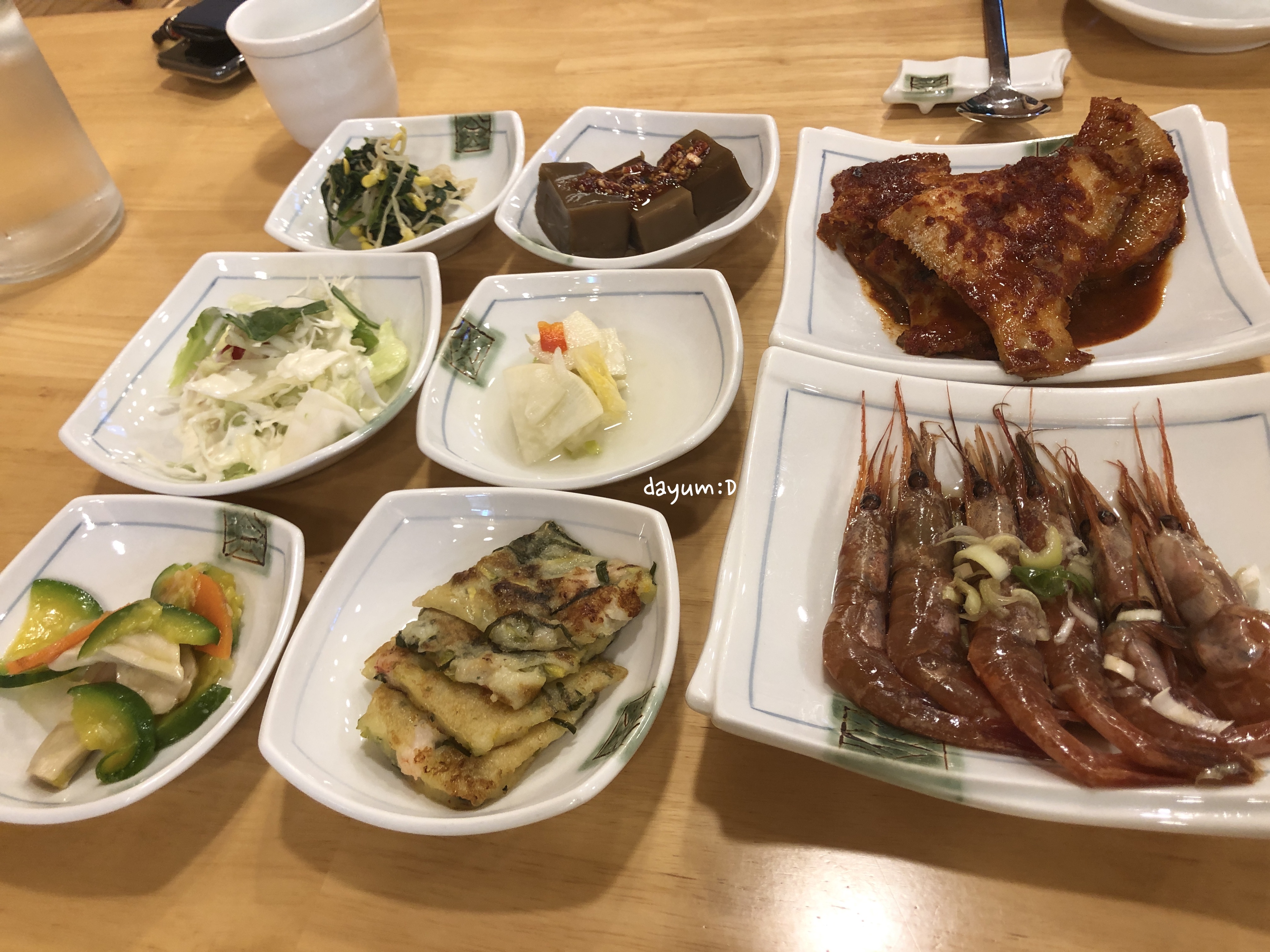 주문을 하고 조금만 기다리면 반찬들이 나오는데, 나물과 김치 샐러드 전, 밑반찬들이 나오고 가자미조림(남편이 환장함), 새우장(둘다 잘 못먹지만 나왔으니 도전..!), 불고기, 가자미 회무침(나만 먹음), 된장찌개가 나온다.
