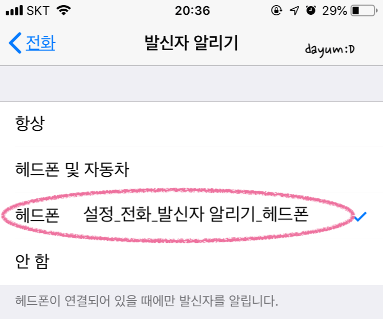 에어팟은 사용중인 기기에는 안뜨고 블루투스 목록에 뜨는데 거기서 왼쪽, 오른쪽 톡톡 건들였을때 기능 설정이 가능하다. 그리고 전화 설정에서 발신자 알리기를 헤드폰으로 했을때 누구에게 전화왔는데 음성으로 알려주는 기능도 설정해 두었다.
