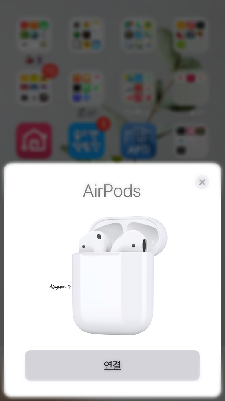 페어링 방법은 아주 간단하다. 에어팟 뚜껑을 열면 아이폰에서 이렇게 연결하라는 표시가 뜬다. 연결을 터치하면 알아서 블루투스가 켜지면서 페어링된다. 애플워치에서는 별다른 설정 없이 잘 된다.