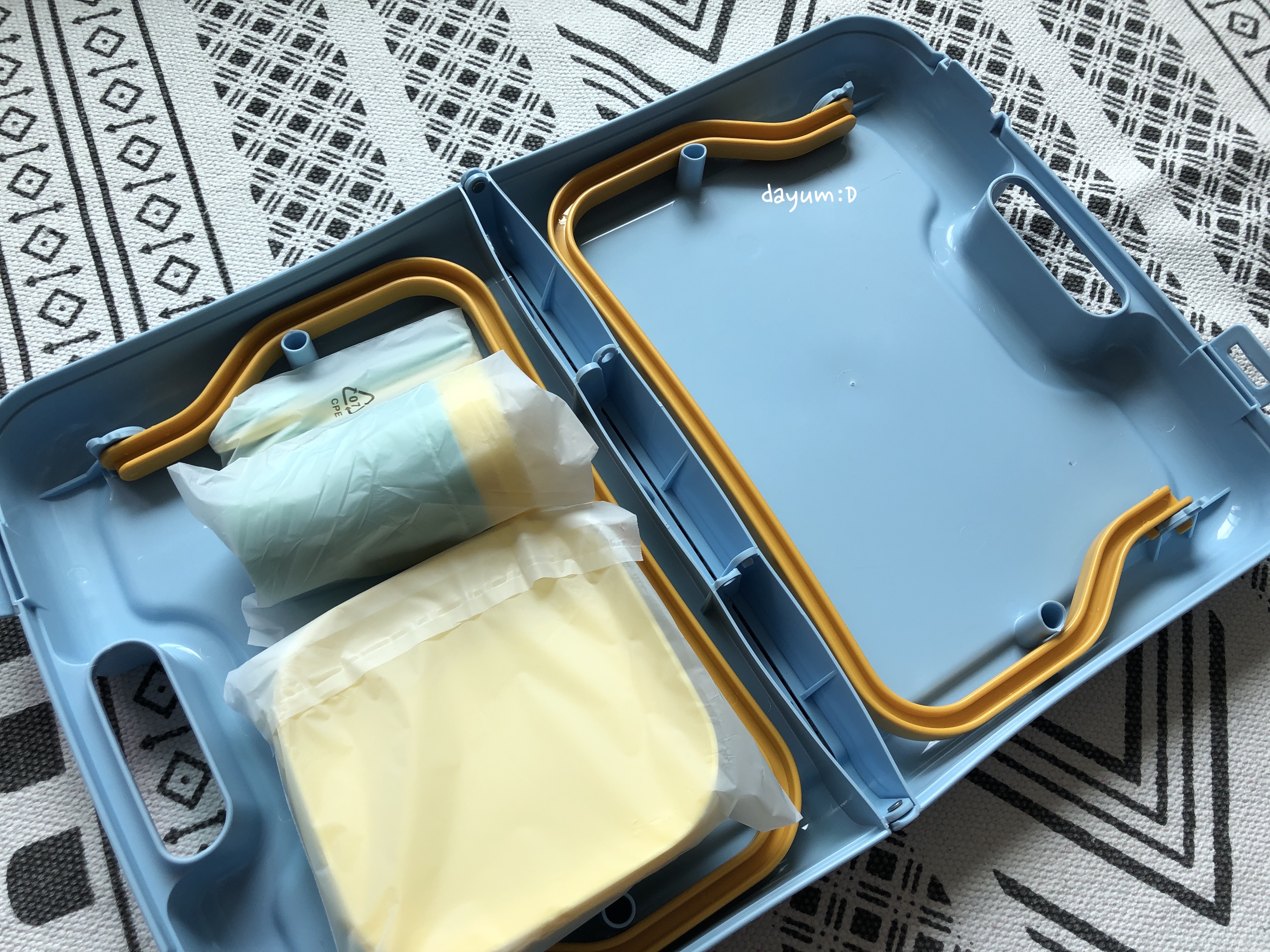 열면, 노란색의 테이블 다리가 접혀져 있고, 한쪽면에 컵4개, 접시4개, 숟가락+포크4세트가 들어있다.