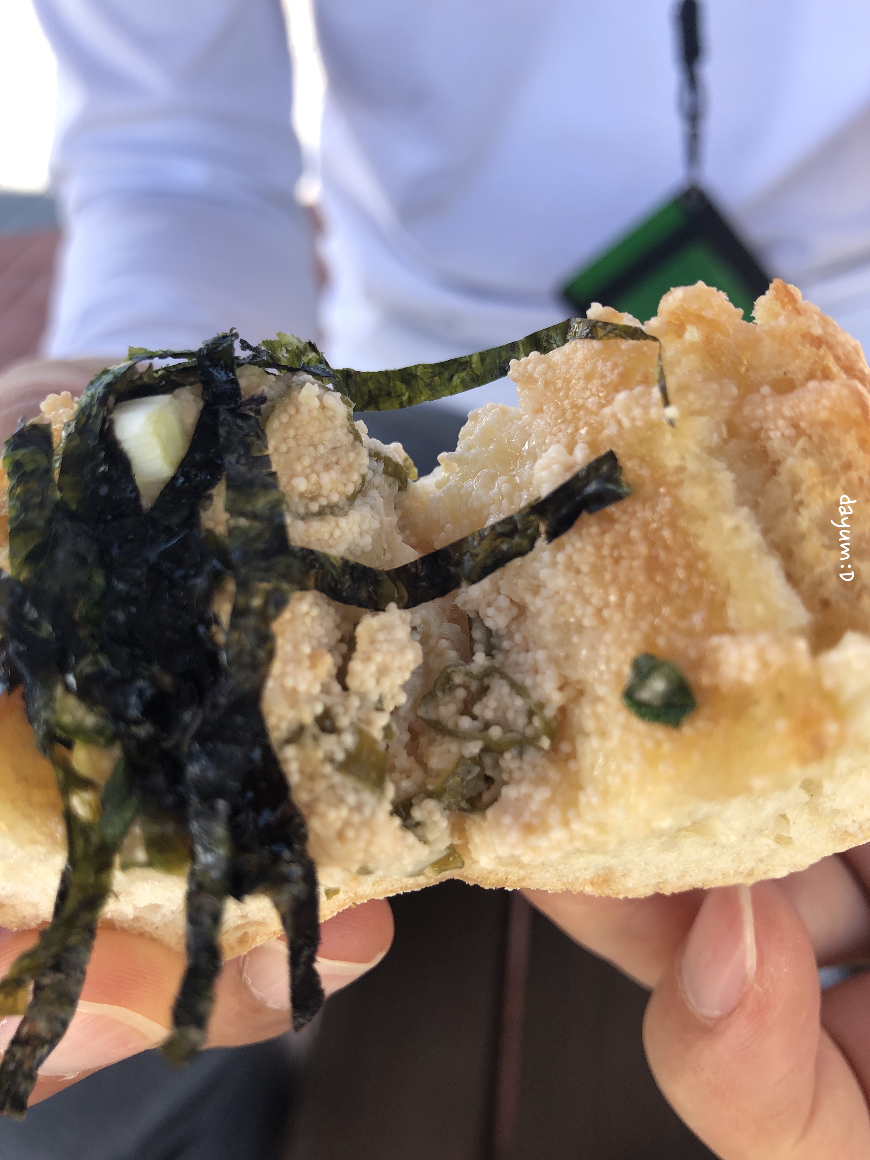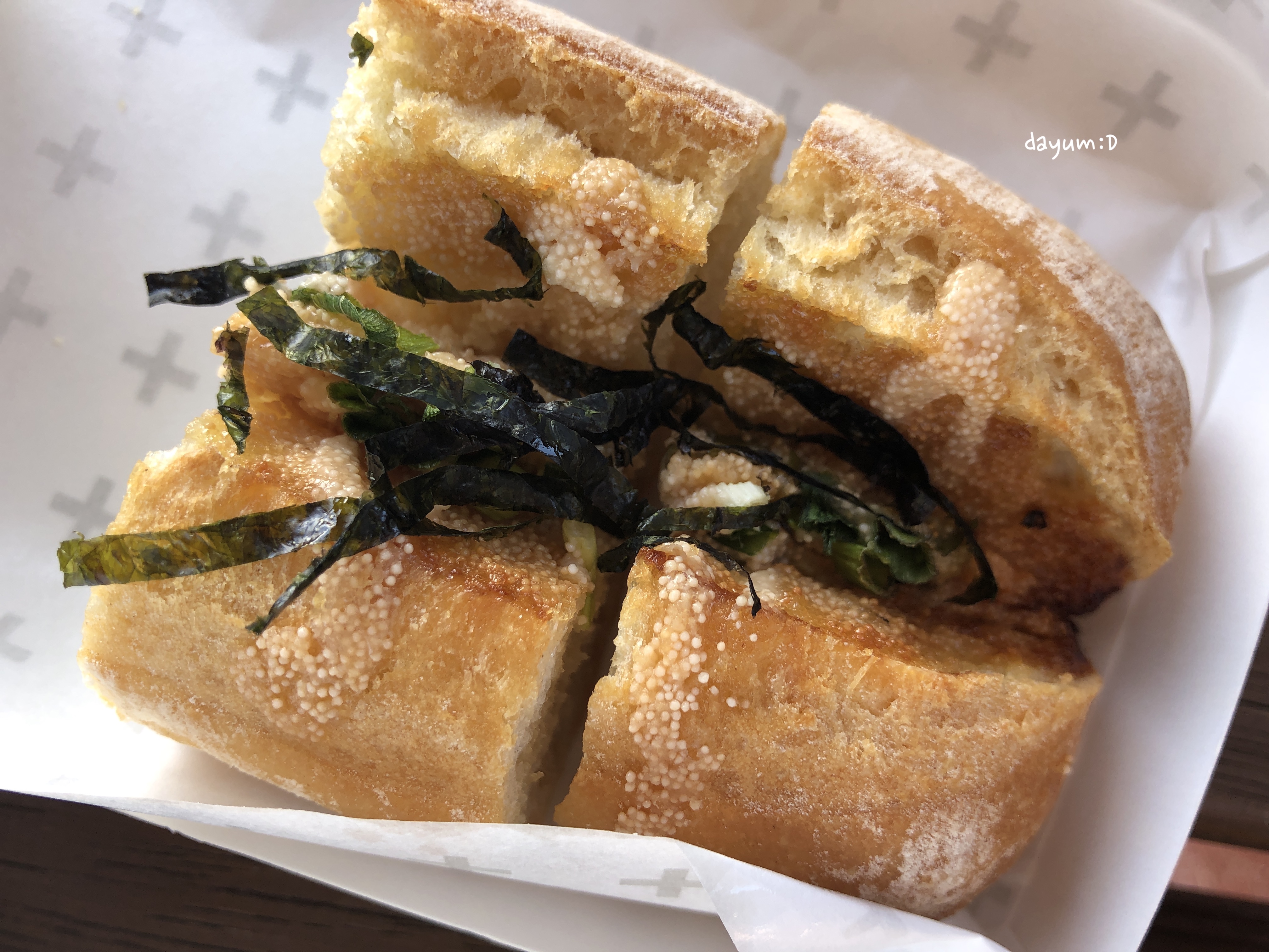 뭘 살까 하다가, 명란바게트와 애플파이, 블루베리파이를 사서, 파이는 가게 앞에서 다 먹고 명란바게트는 스트라이다 짐칸에 싣고 묵호항여객터미널 앞에서 맑은 하늘 보면서 먹었당.