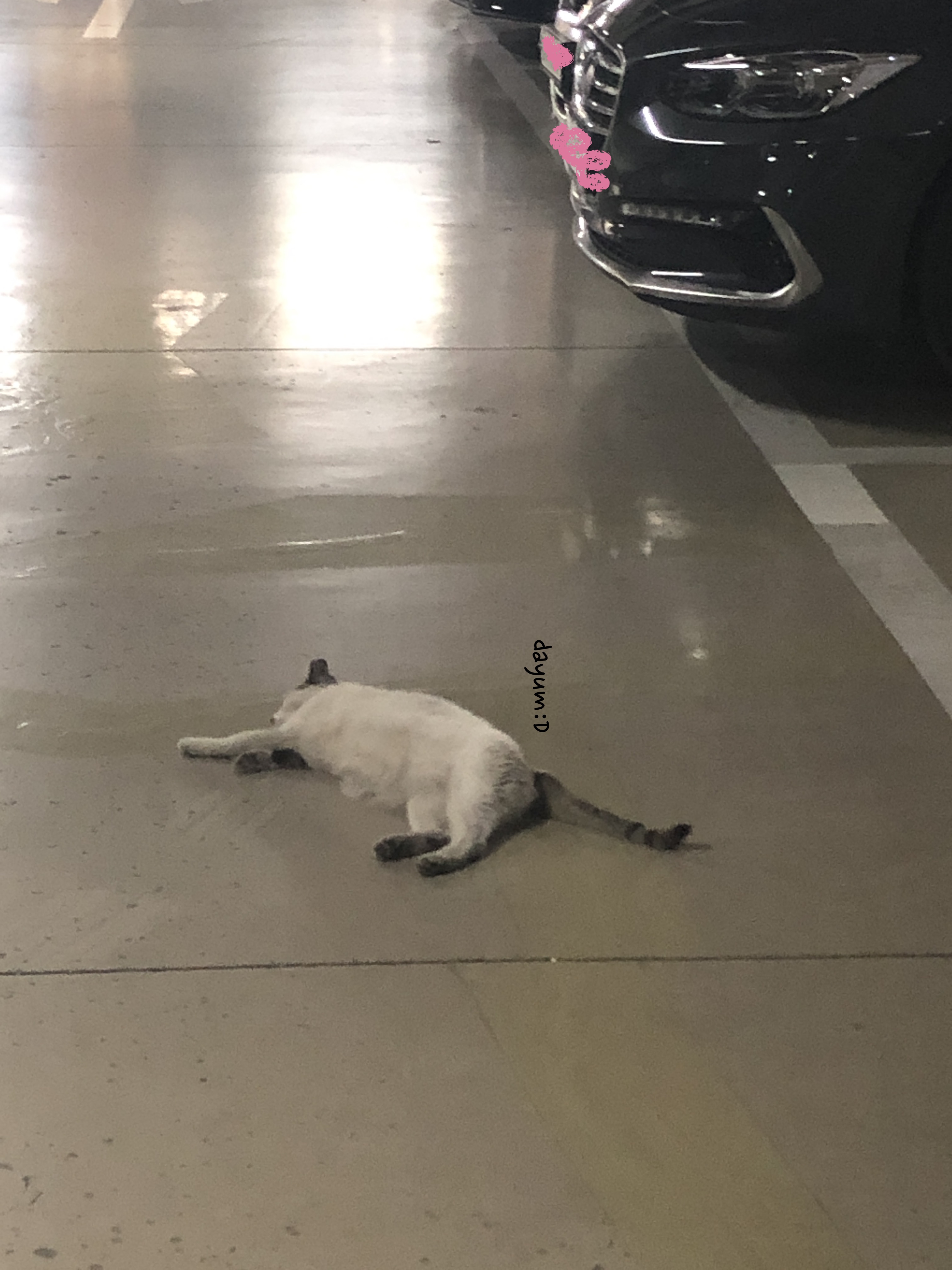 남편이 '나 출근해야해, 고양아 내려와줘' 사정사정해서 내려와줌. 그대로 바닥에 벌러덩한 고냥이! 차 시동 거니까 옆차로 이동해서 잔당