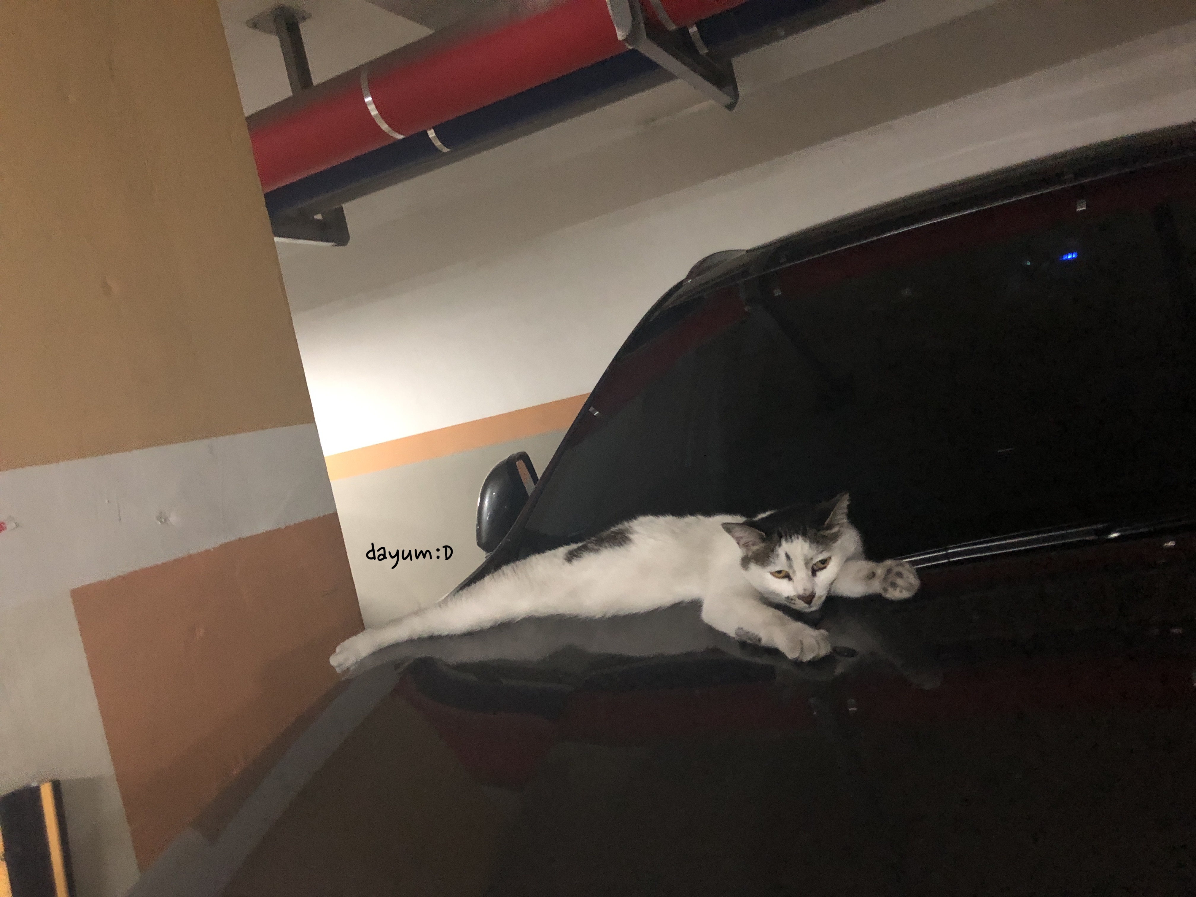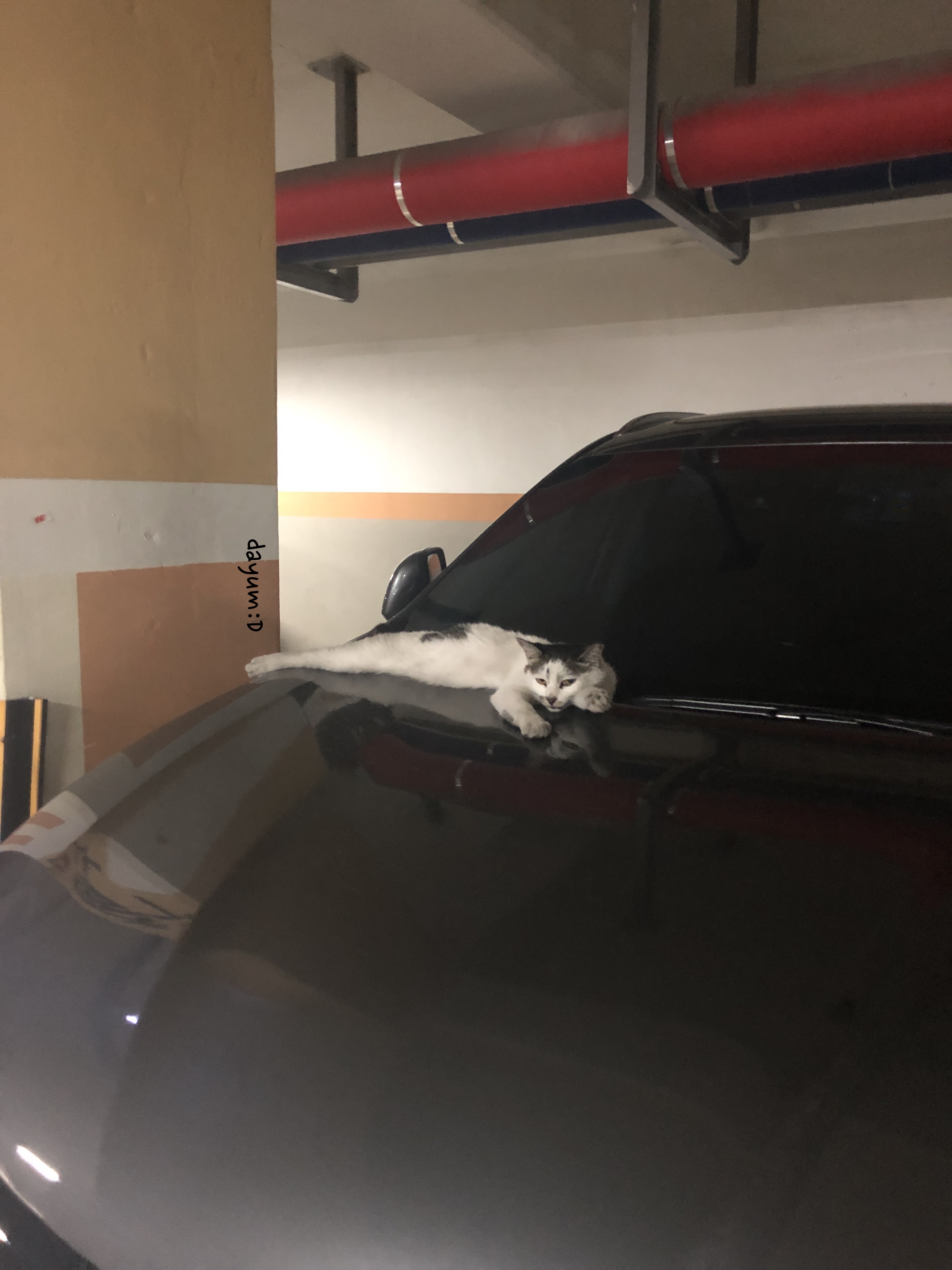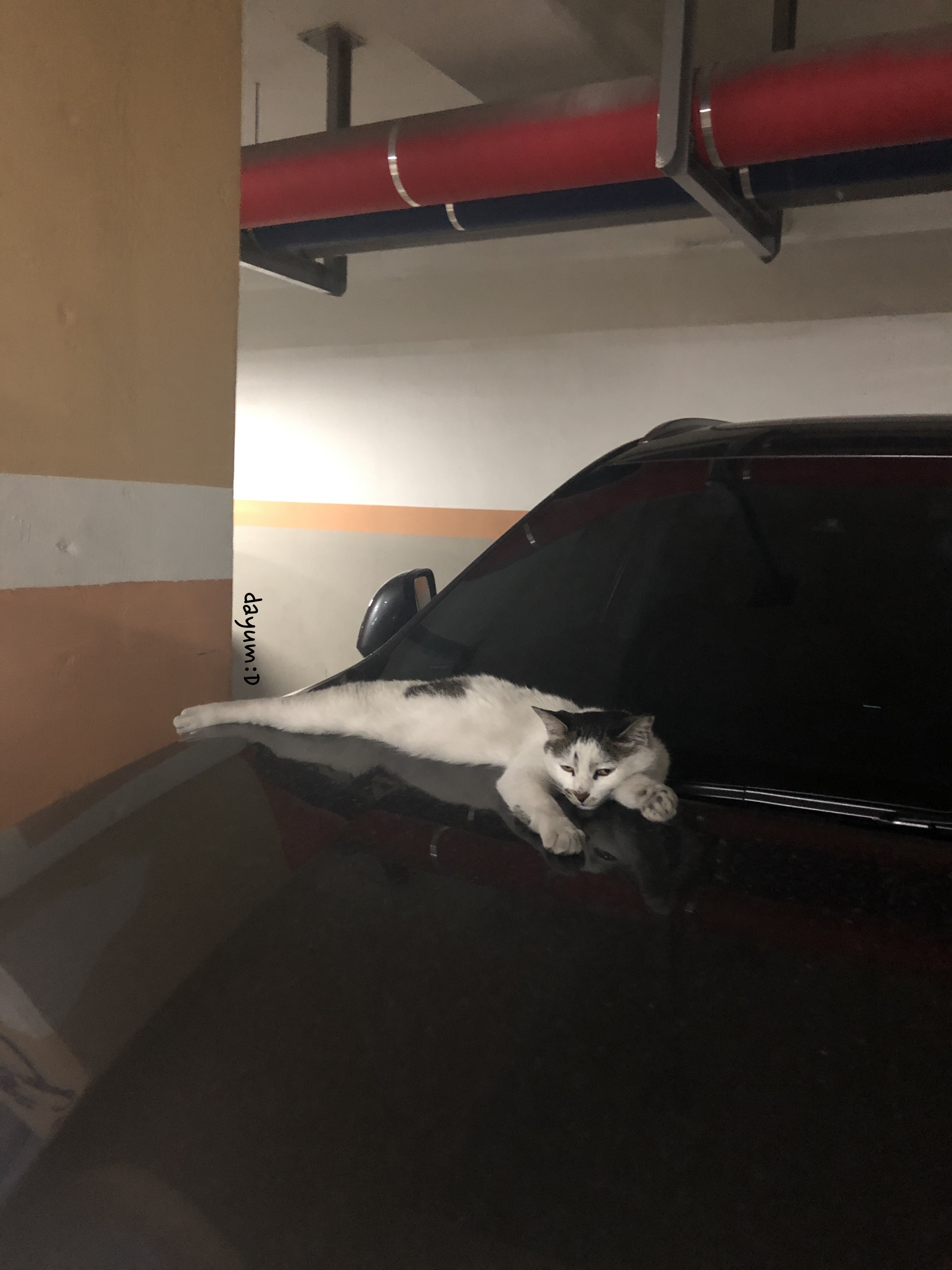아침에는 아파트 단지내 놀이터에서 놀다가 잠 잘때는 지하주차장으로 내려와서 뜨끈한 차 위에서 잔다 ㅋㅋ 지하주차장 지나가다 보면 몇몇차에 얘 발자국 남아있다 ㅋㅋ