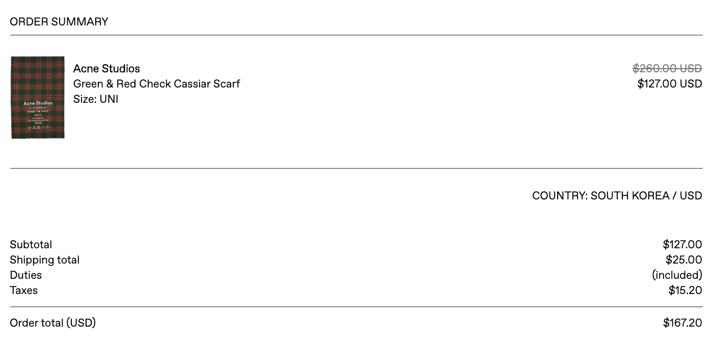 이게 한국 설정 가격인데, 127달러에 25달러 배송비가 붙고, 이 금액이 150달러가 넘어서 부가세 15.2달러가 또 붙었다.