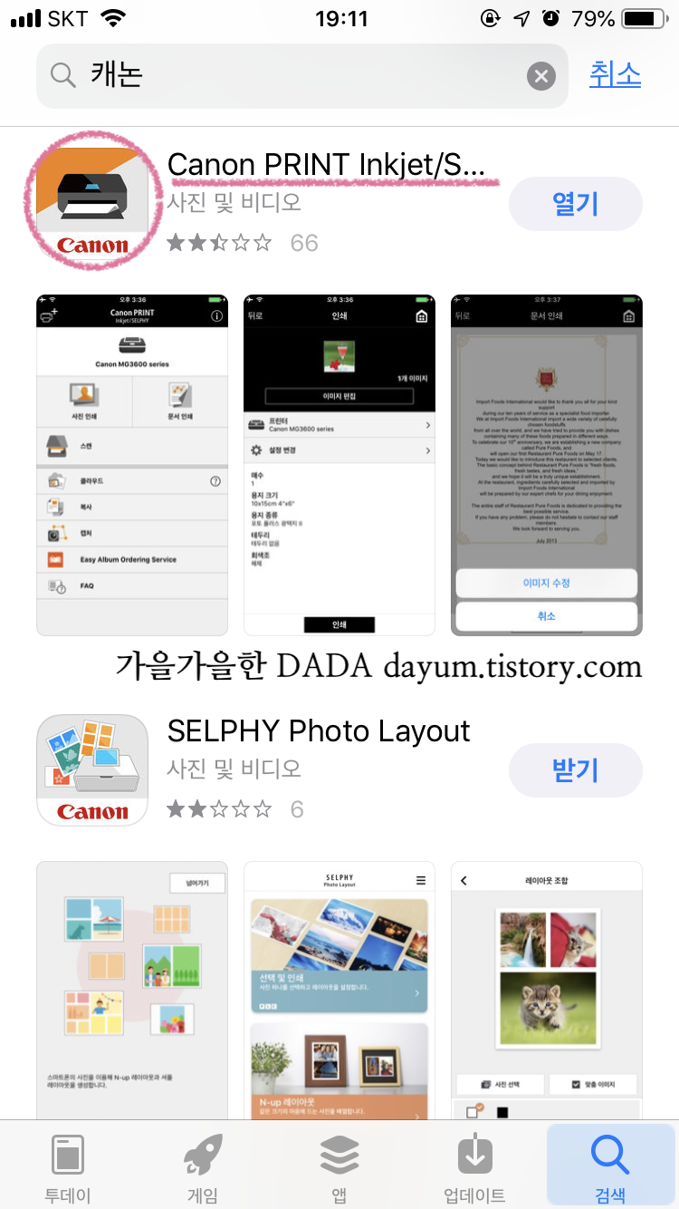 1. 앱스토어에 들어가서 캐논을 검색하고 아래와 같은 어플을 다운받는다.