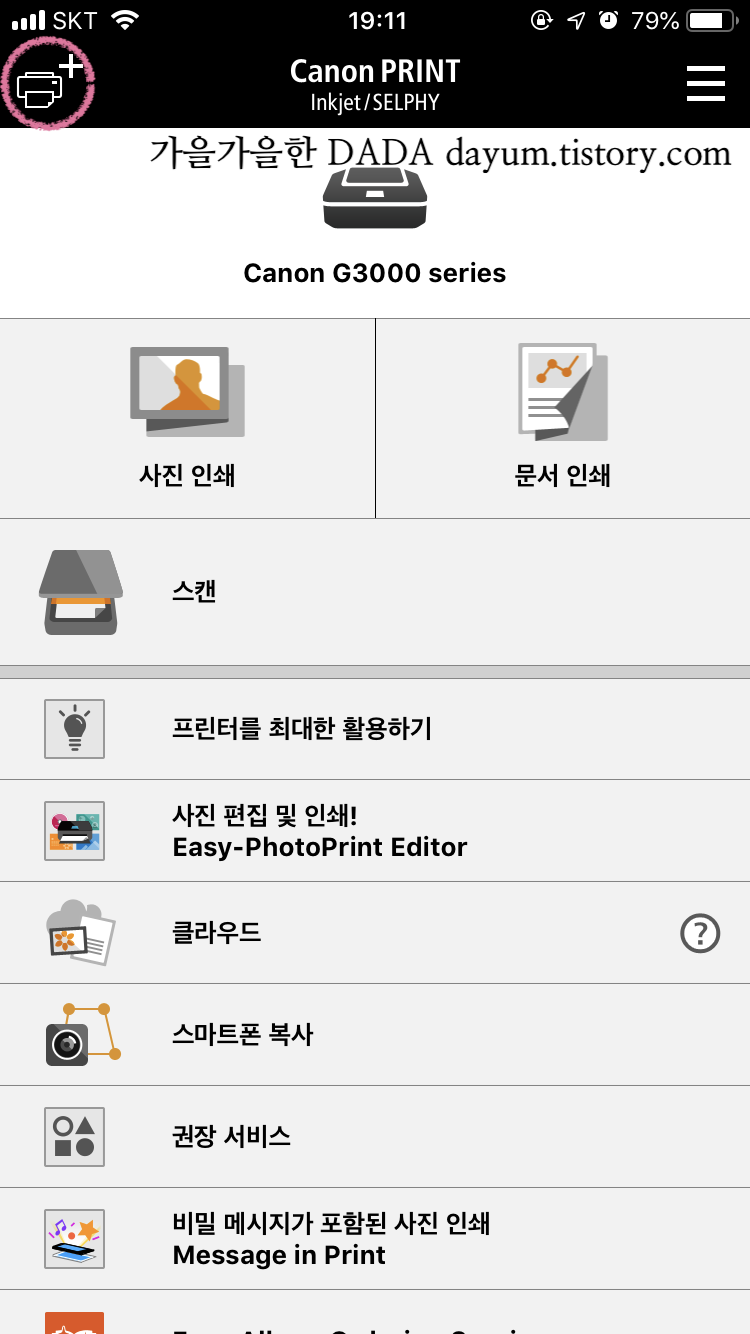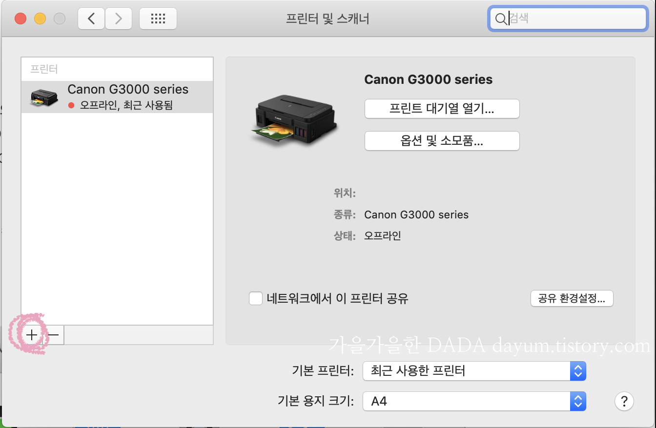 2. + (핑크색으로 표시한 버튼)를 누르면 프린트 목록이 뜨는데 이때 G3000누르면 끝. (나는 이미 설치해서 목록에 있음)