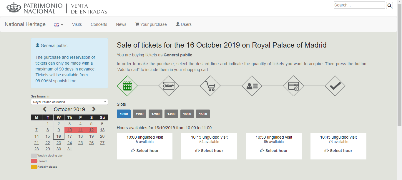아래 마드리드 왕궁을 클릭하고 제너럴 퍼블릭 선택 후 방문날짜와 입장시간을 선택하면 된다.