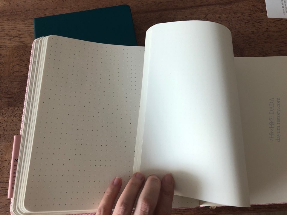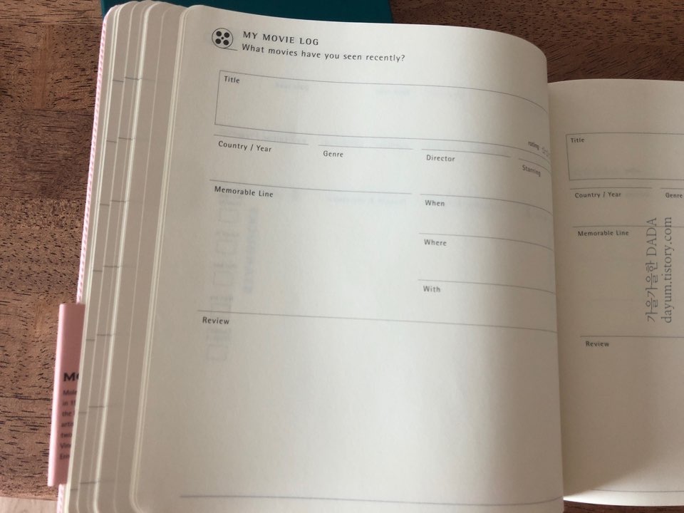계산대 앞에 비치된 다이어리 견본품 구경하다가 핑크랑 초록이로 교환했는데, 핑크는 달력이랑 프리노트를 비롯해 북로그도 있고 영화로그도 있어서 비정기적으로 메모 할 내가 사용할 예정이고, 남편은 데일리 다이어리를 사용하기로 해서 초록이로 선택했다.