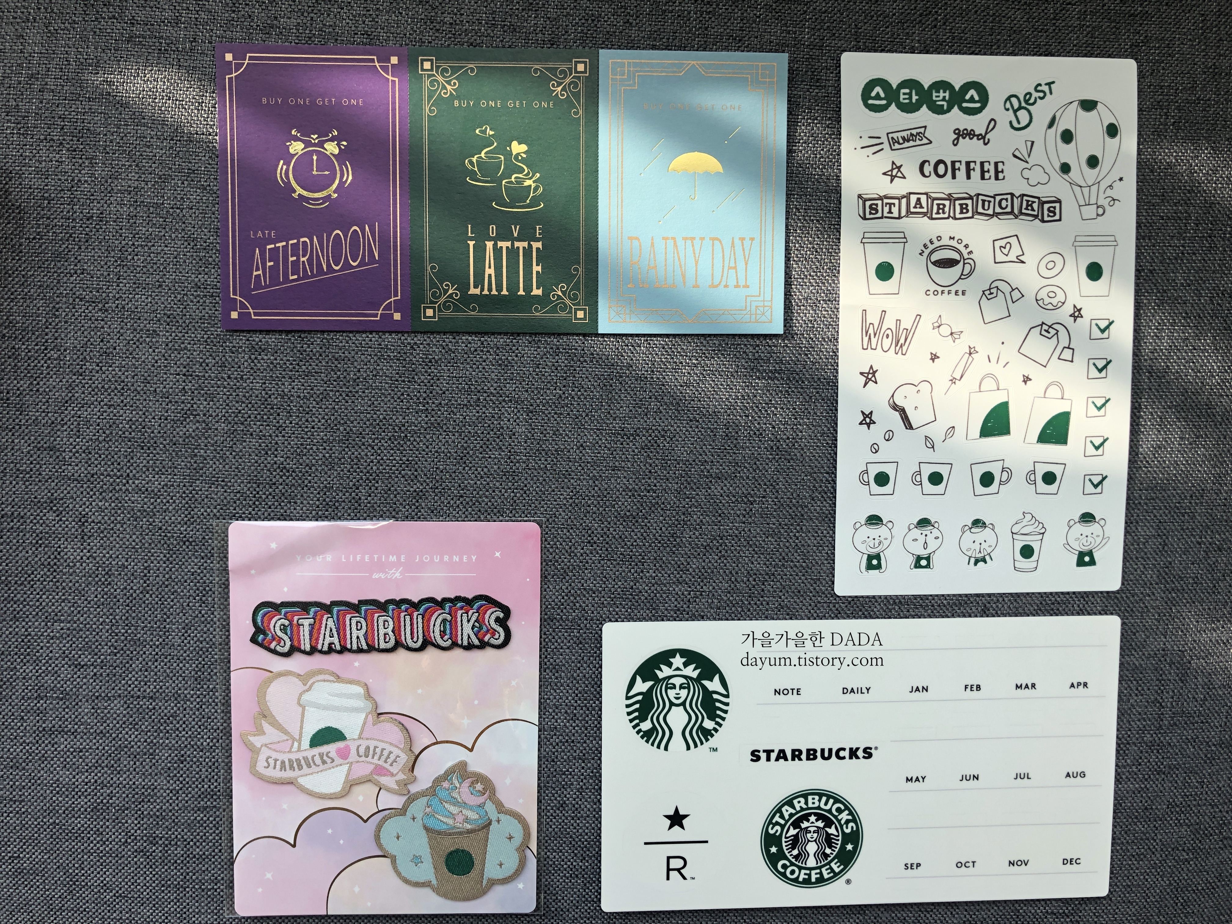 이건 핑크색 다이어리 구성품인데, 음료 쿠폰이랑 스티커, 와펜스티커가 다이어리 맨 뒷쪽 주머니에 들어있다.