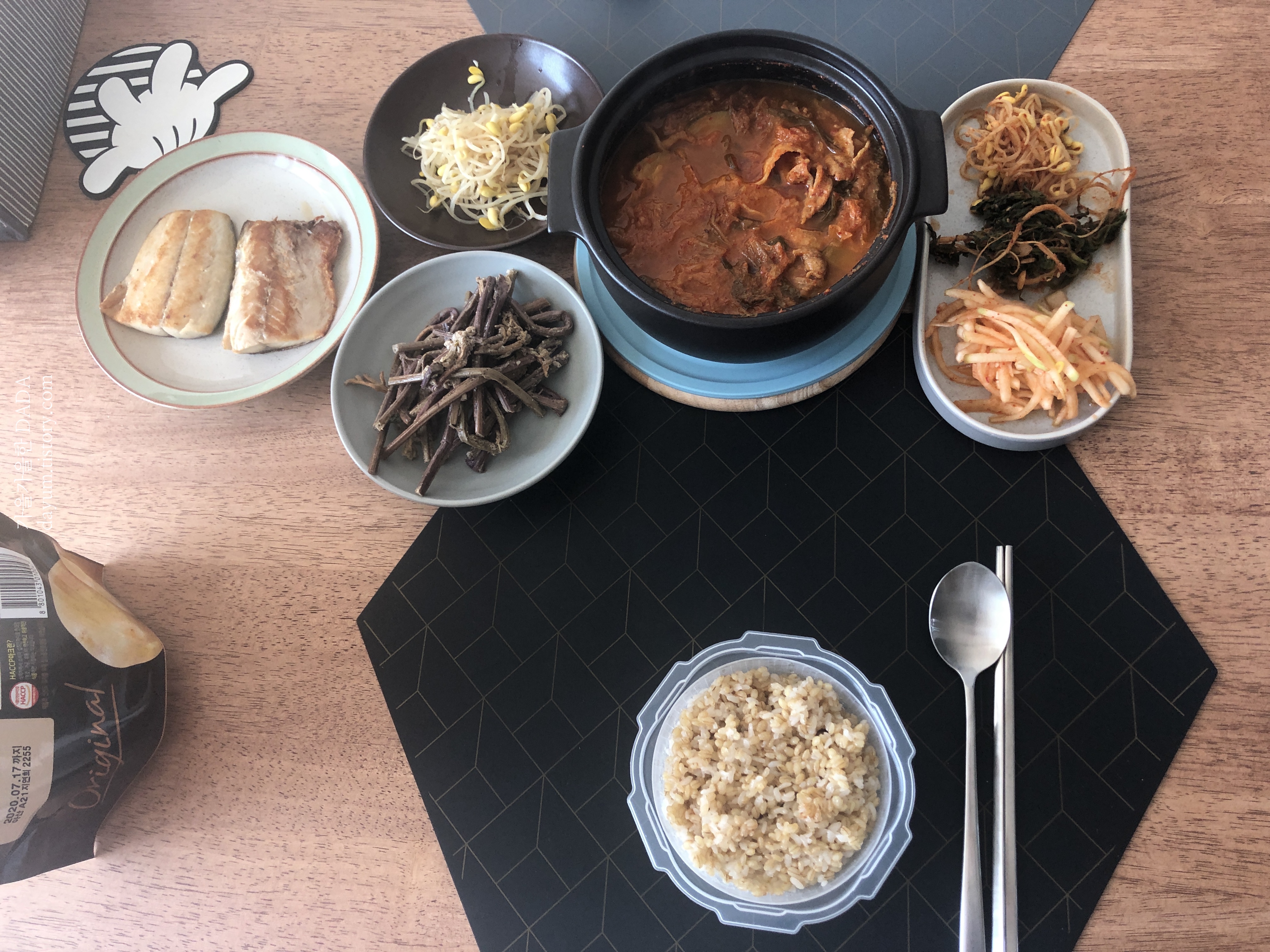 대패삼겹살 팍팍 넣어서 끓인 김치찌개와 각종 나물들