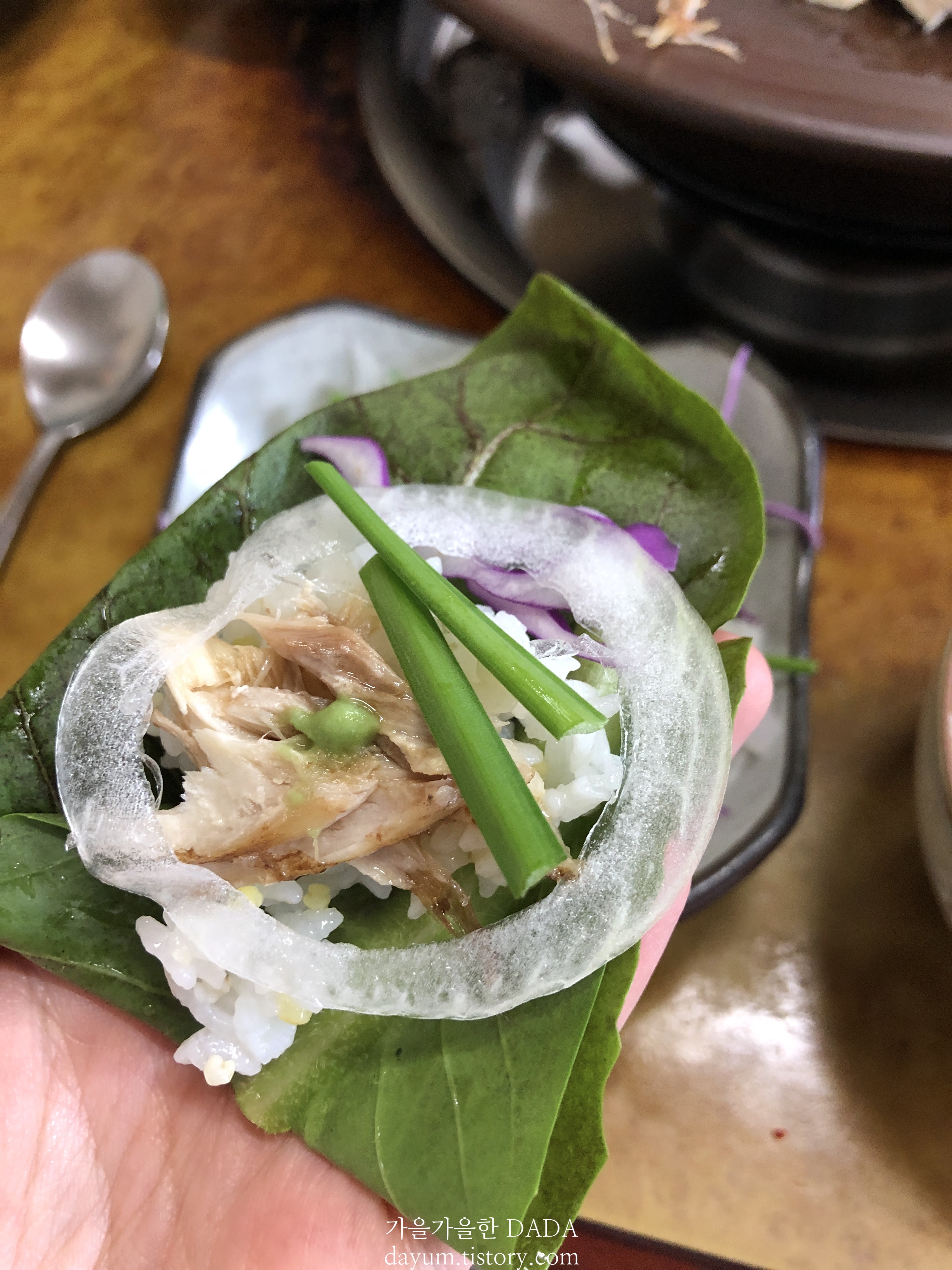 밥 옆에 있는 양파와 부추, 양배추를 간장에 적셔 생선살을 발라 밥 위에 얹어 먹으면 장난아니다. 막장? 이라고 하는 어두운 색의 쌈장은 색은 진하지만 그렇게 짜지 않아서 입맛에 딱이었다.
