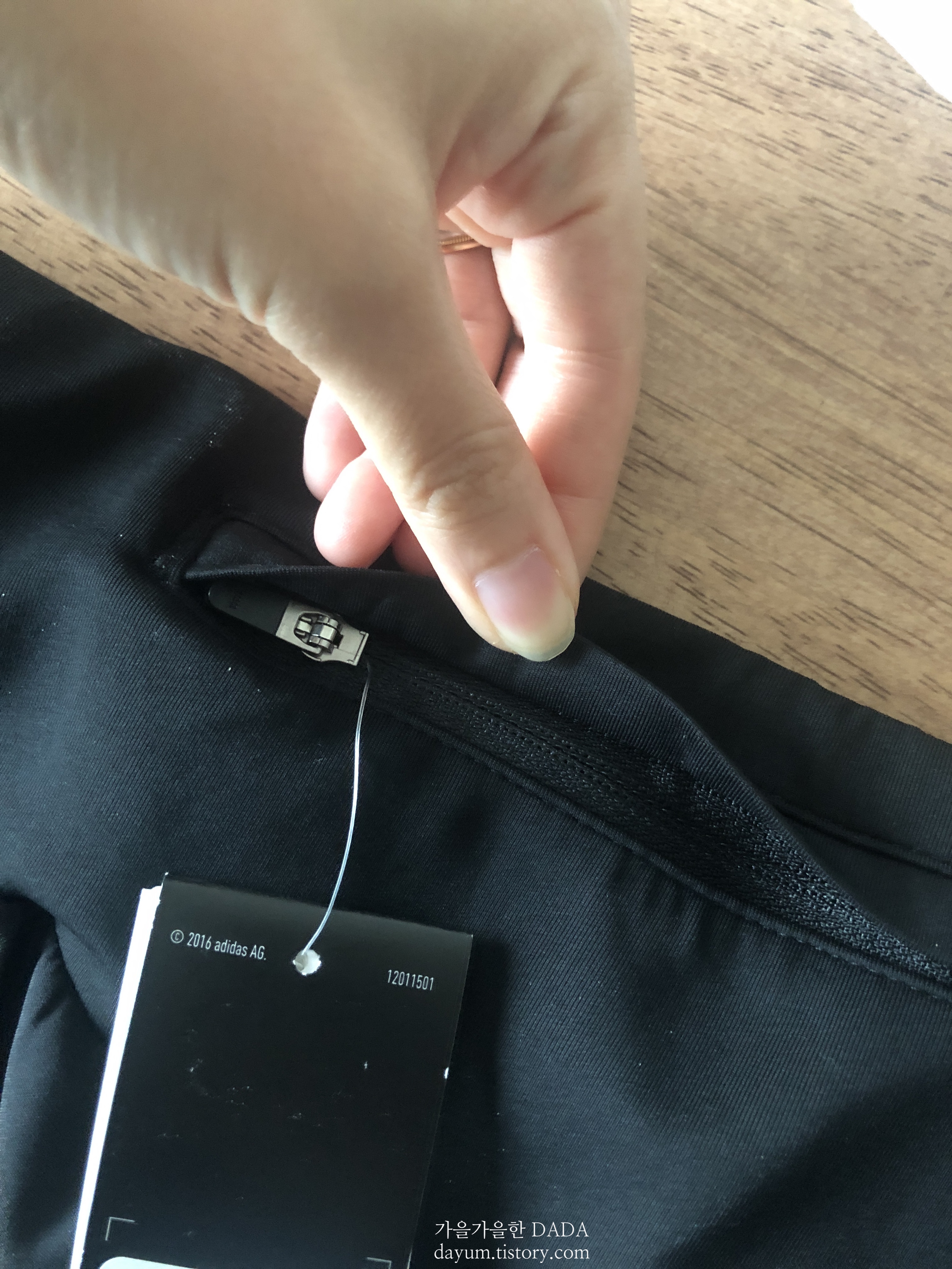 뒷면에는 요렇게 지퍼달린 주머니가 있고, 양쪽 사이드에 있는 띠와 아디다스 로고가 되게 오묘한 색이다.