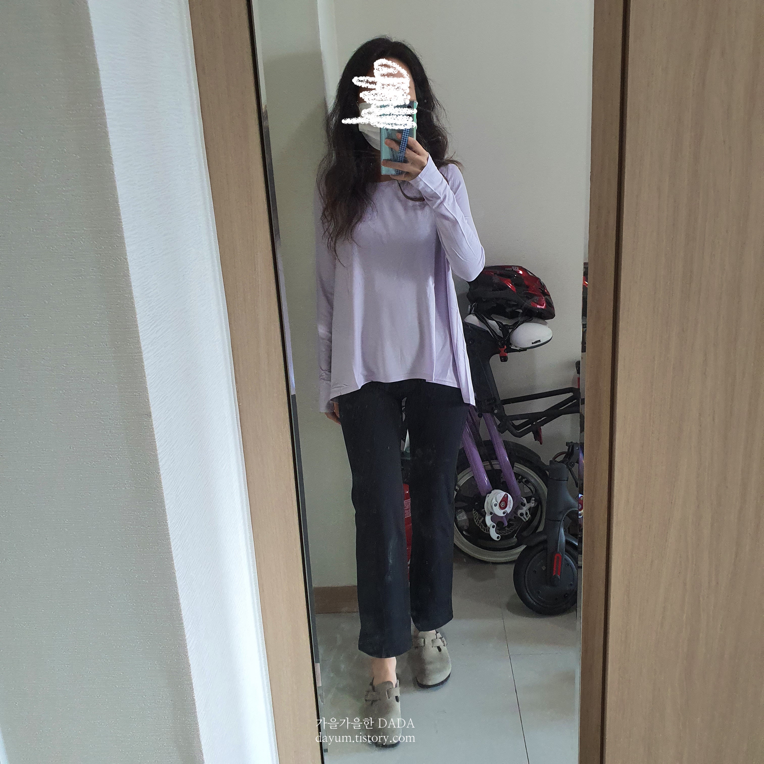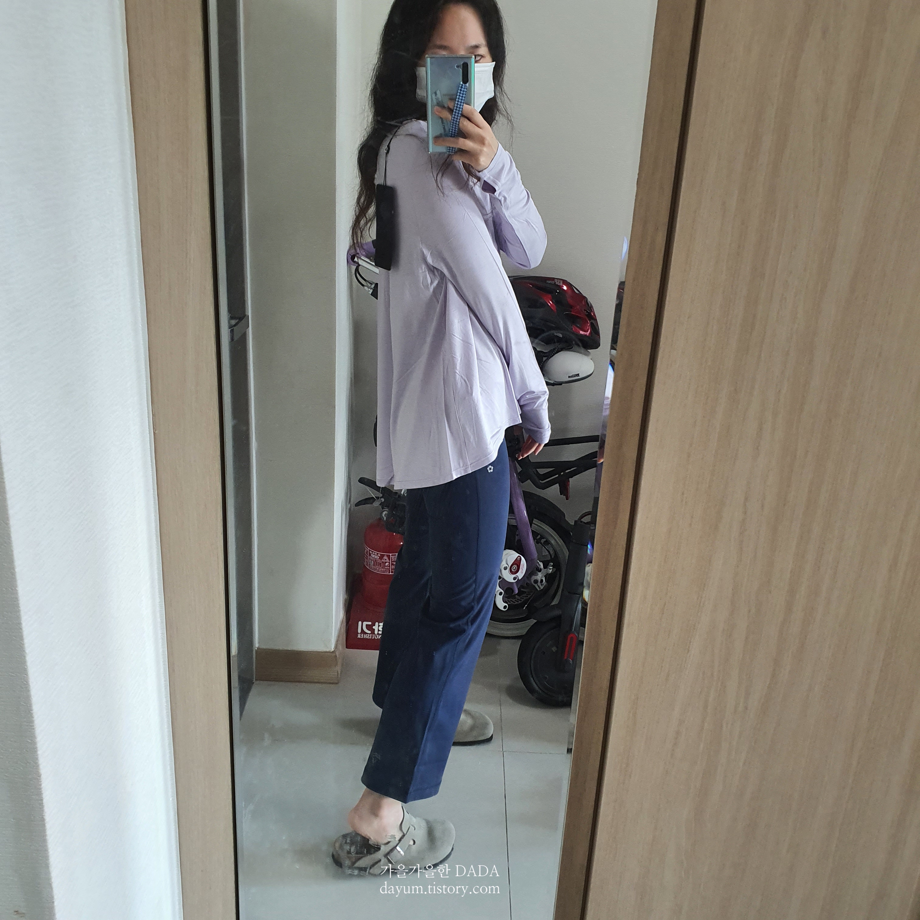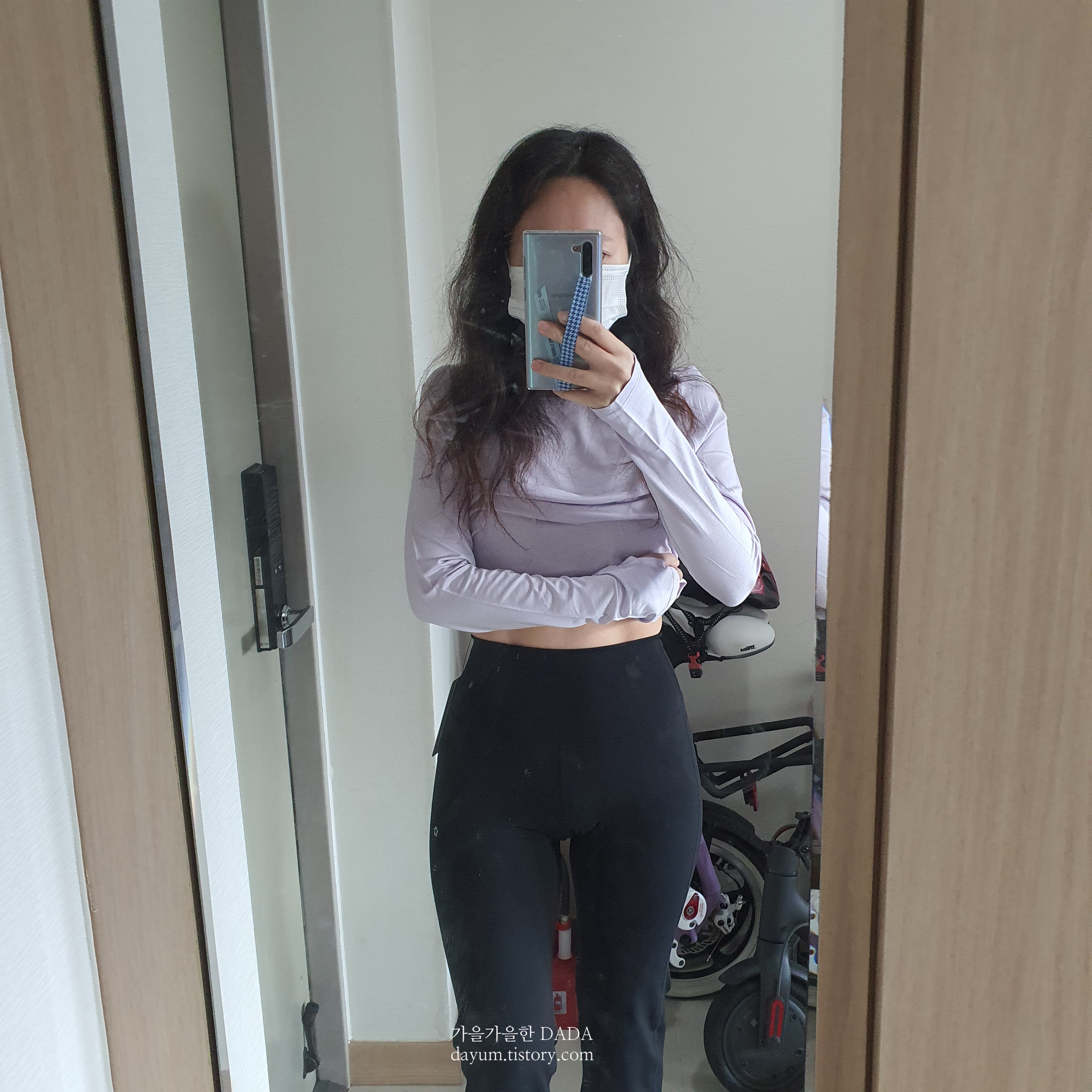 요 플렉시블 롱 슬리브는 앞뒤 기장이 다른데, 블랙은 4, 라일락 색상은 6사이즈로 구입했다.