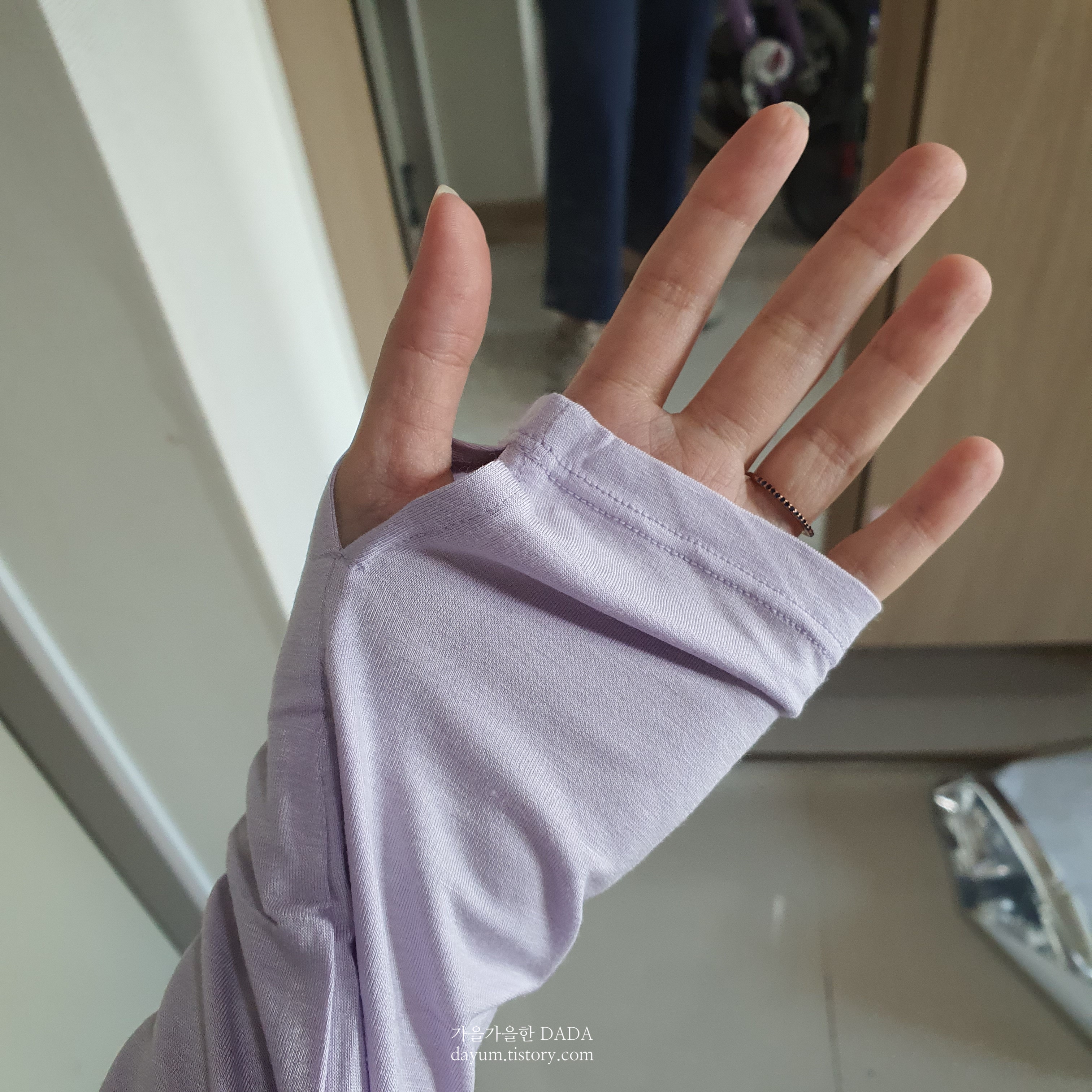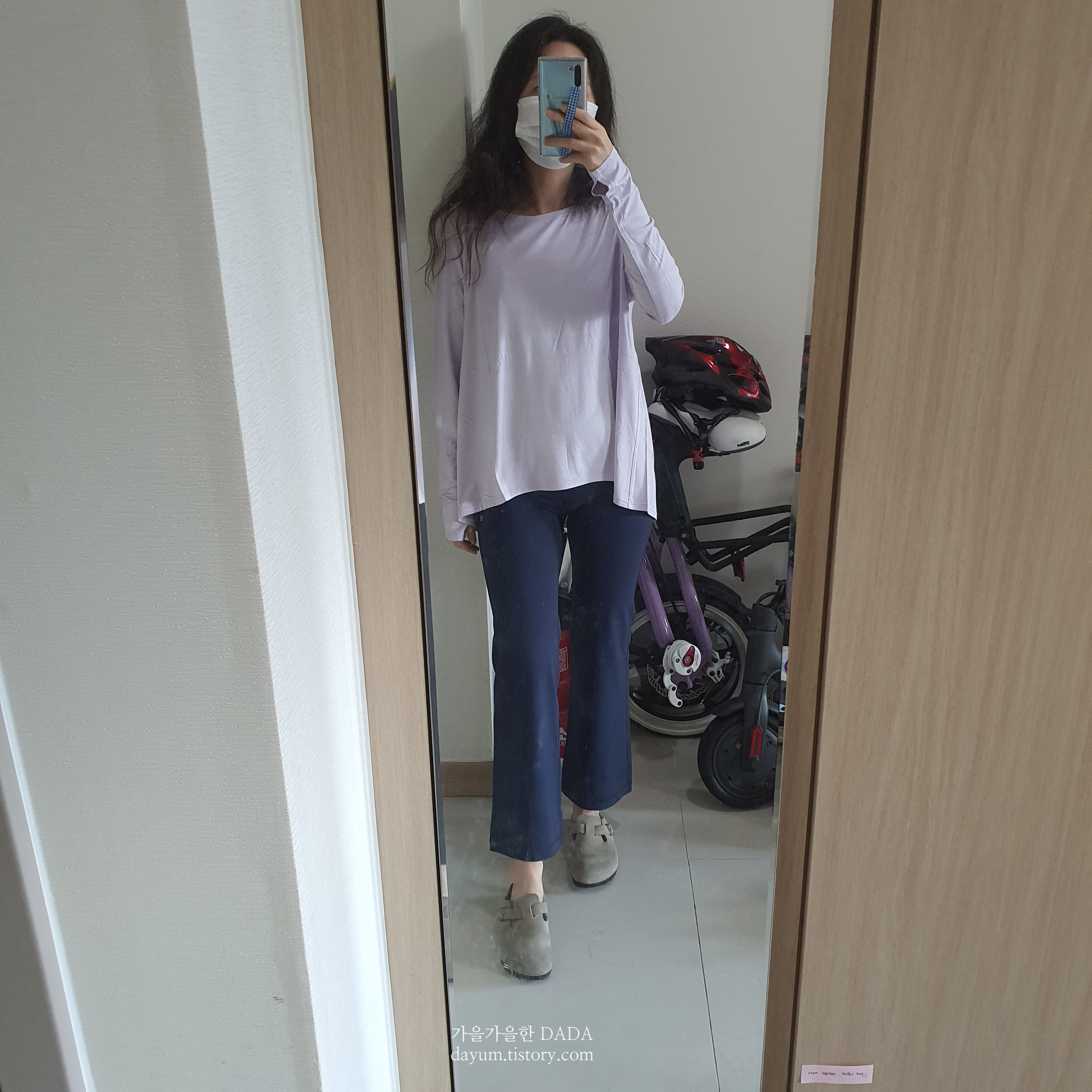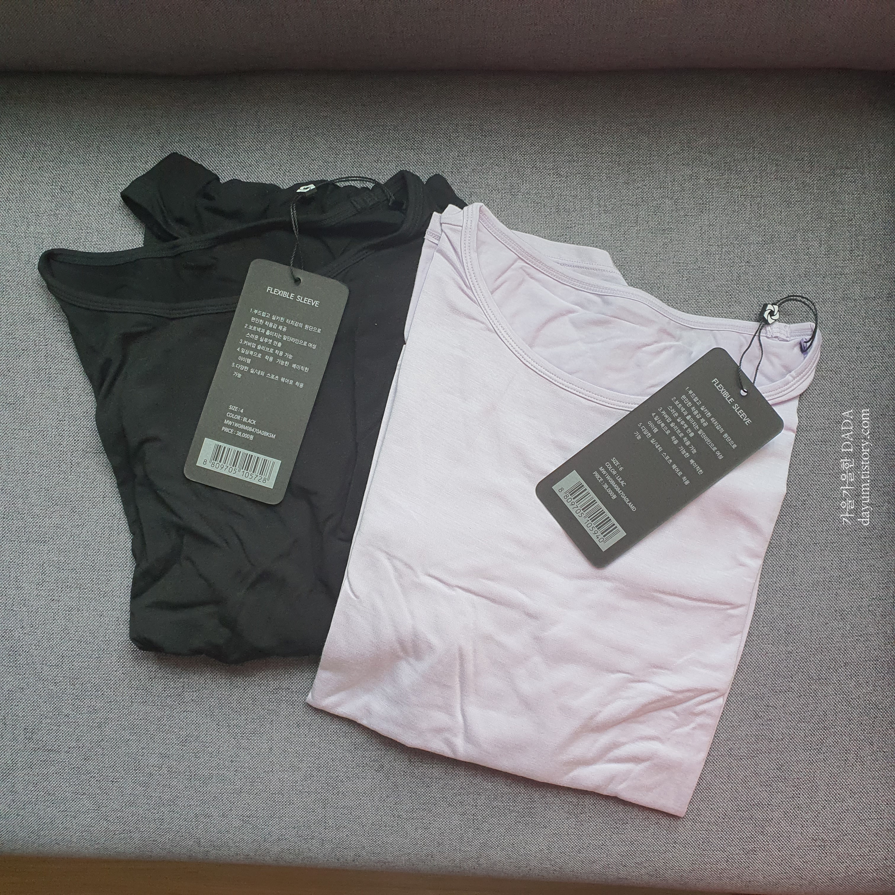 요 플렉시블 롱 슬리브는 앞뒤 기장이 다른데, 블랙은 4, 라일락 색상은 6사이즈로 구입했다.