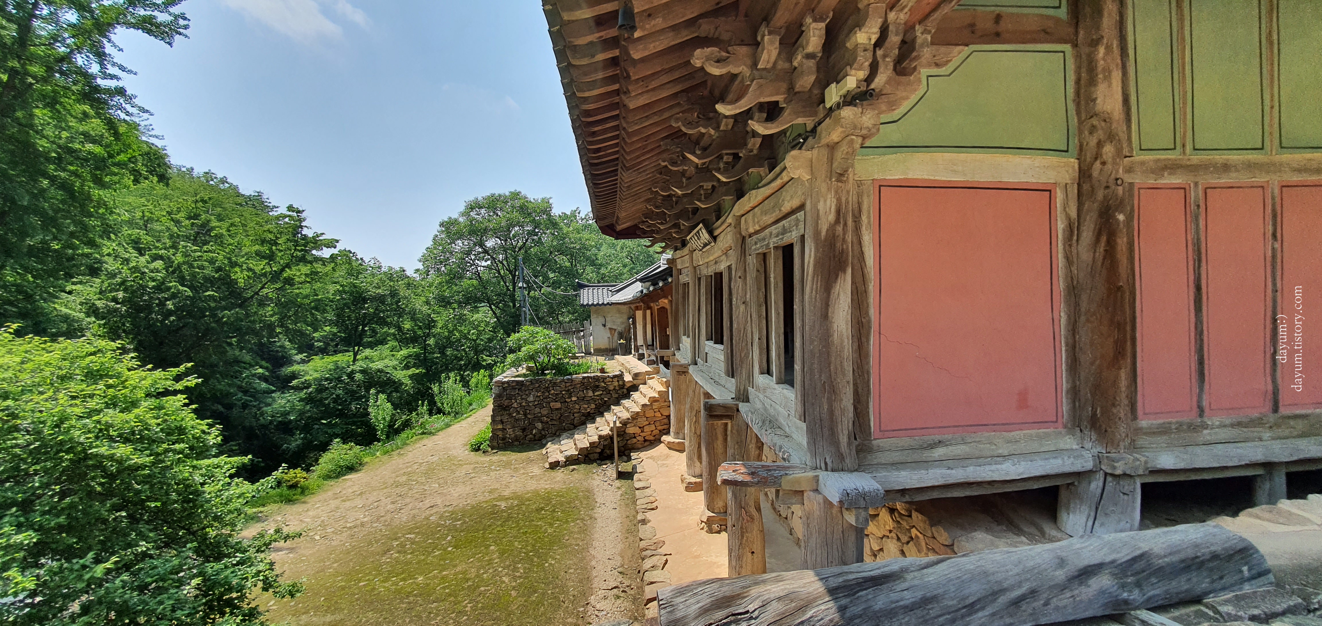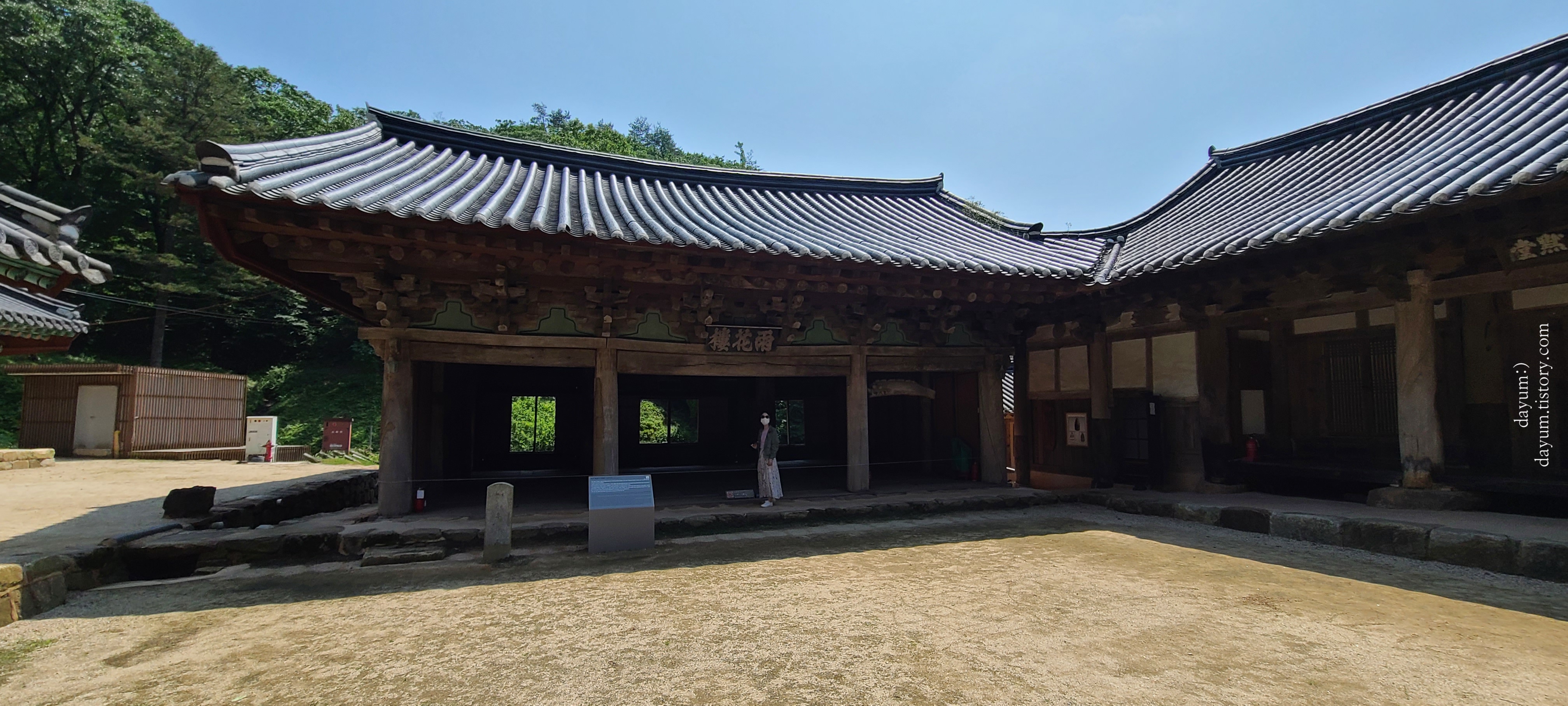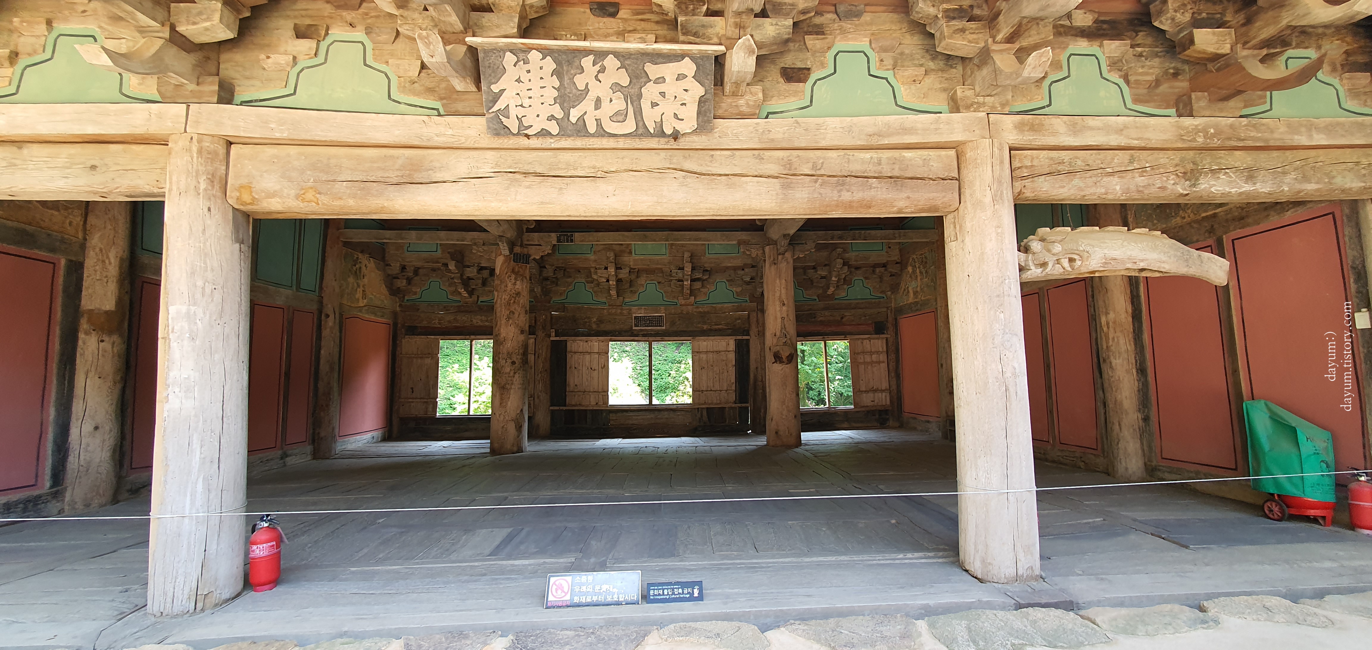완주 화암사에는 밖에서는 2층으로 보이지만 누각 옆의 계단을 올라가 안에서 들어가보면 단층인 우화루와 극락전이 보인다.