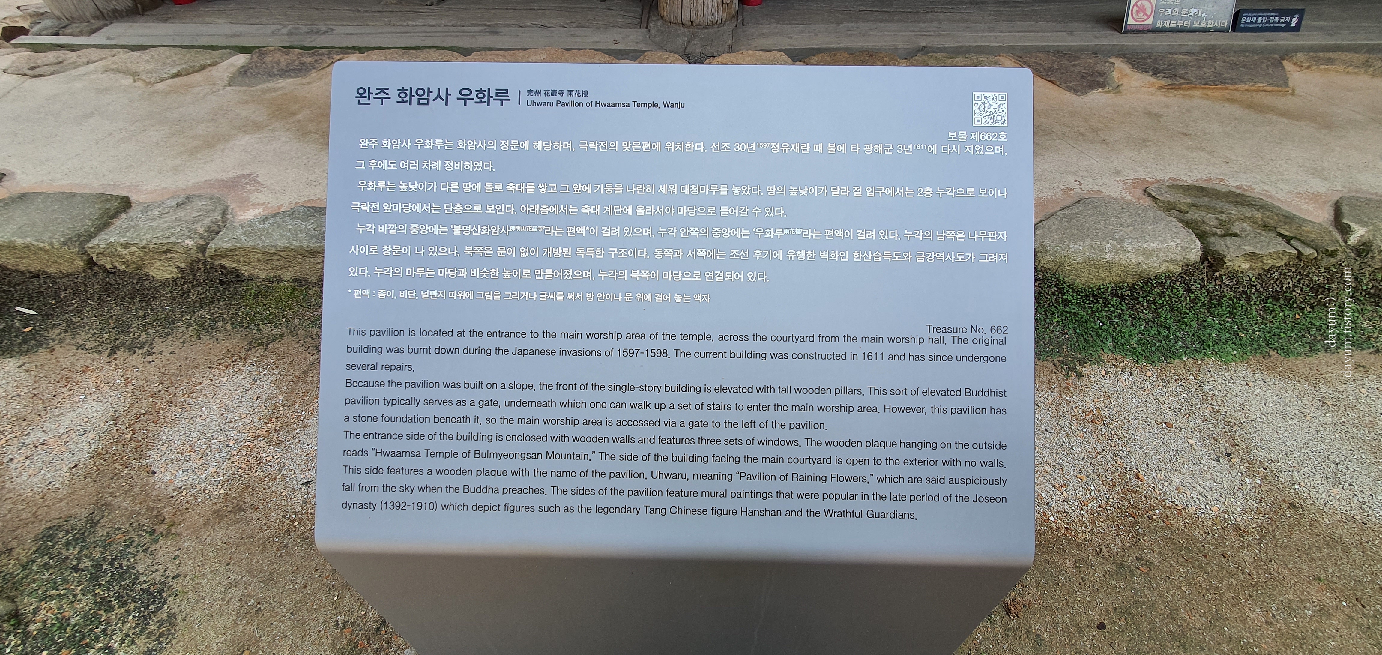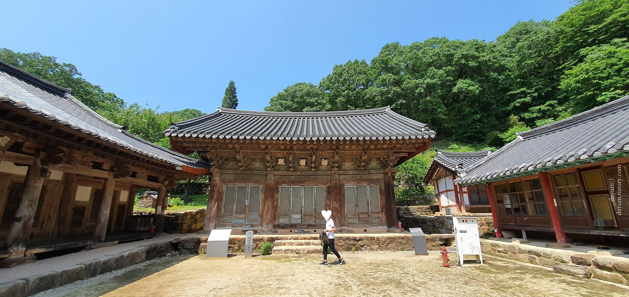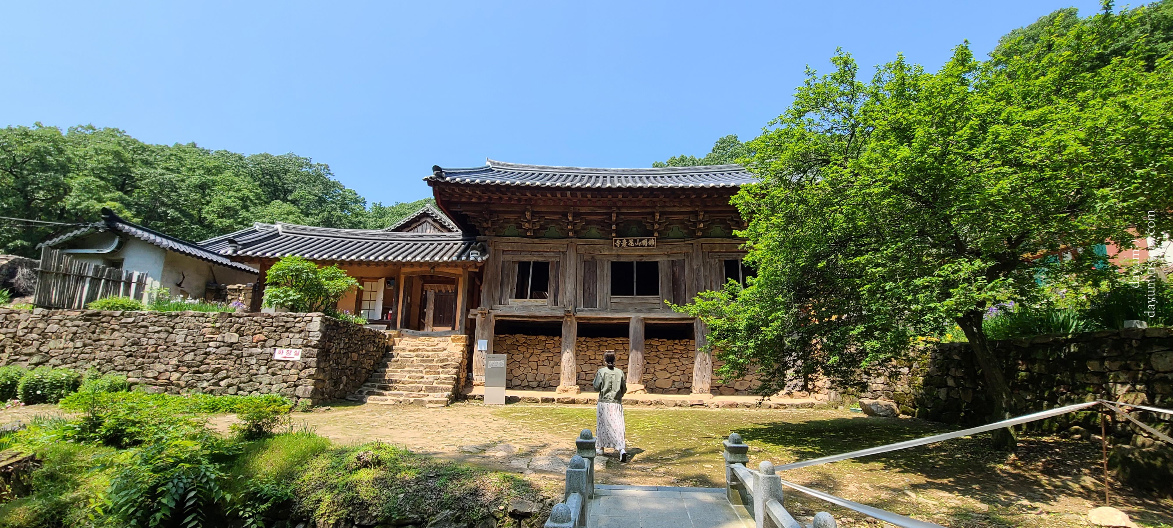 완주 화암사에는 밖에서는 2층으로 보이지만 누각 옆의 계단을 올라가 안에서 들어가보면 단층인 우화루와 극락전이 보인다.