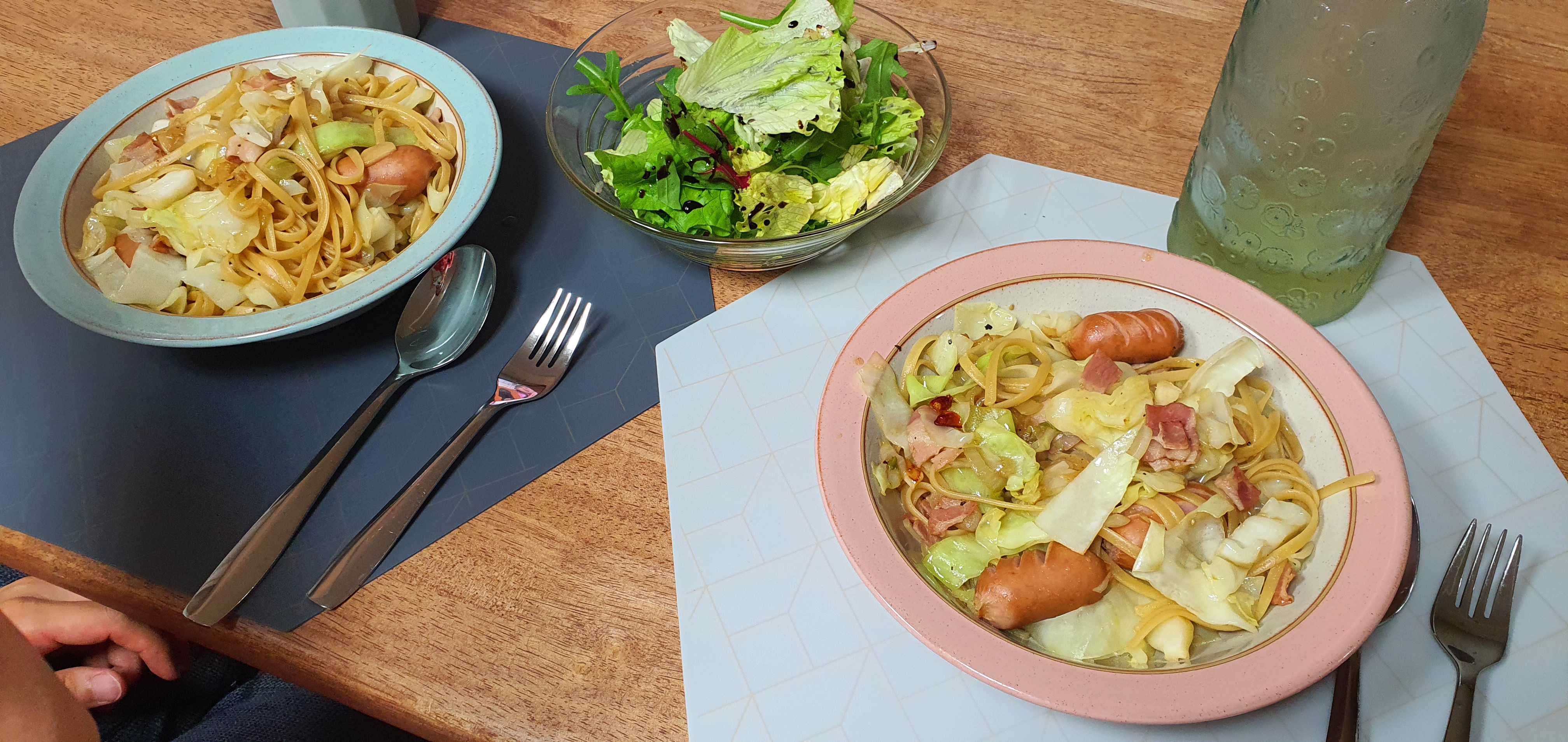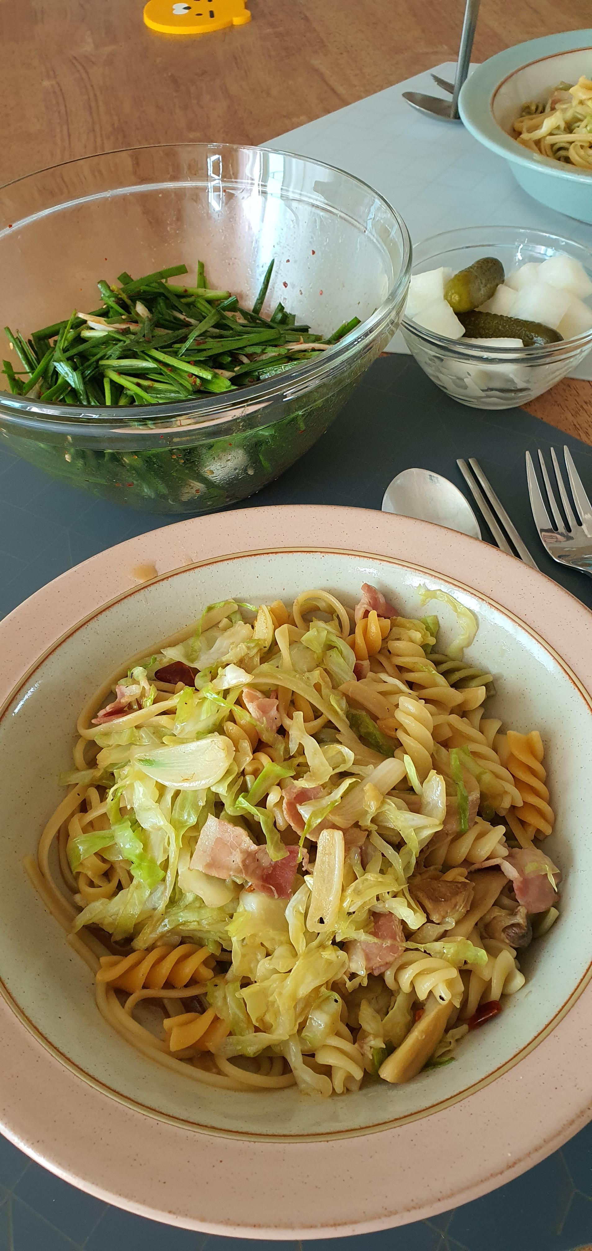 양배추베이컨파스타에 빠짐. 간장을 넣은 -