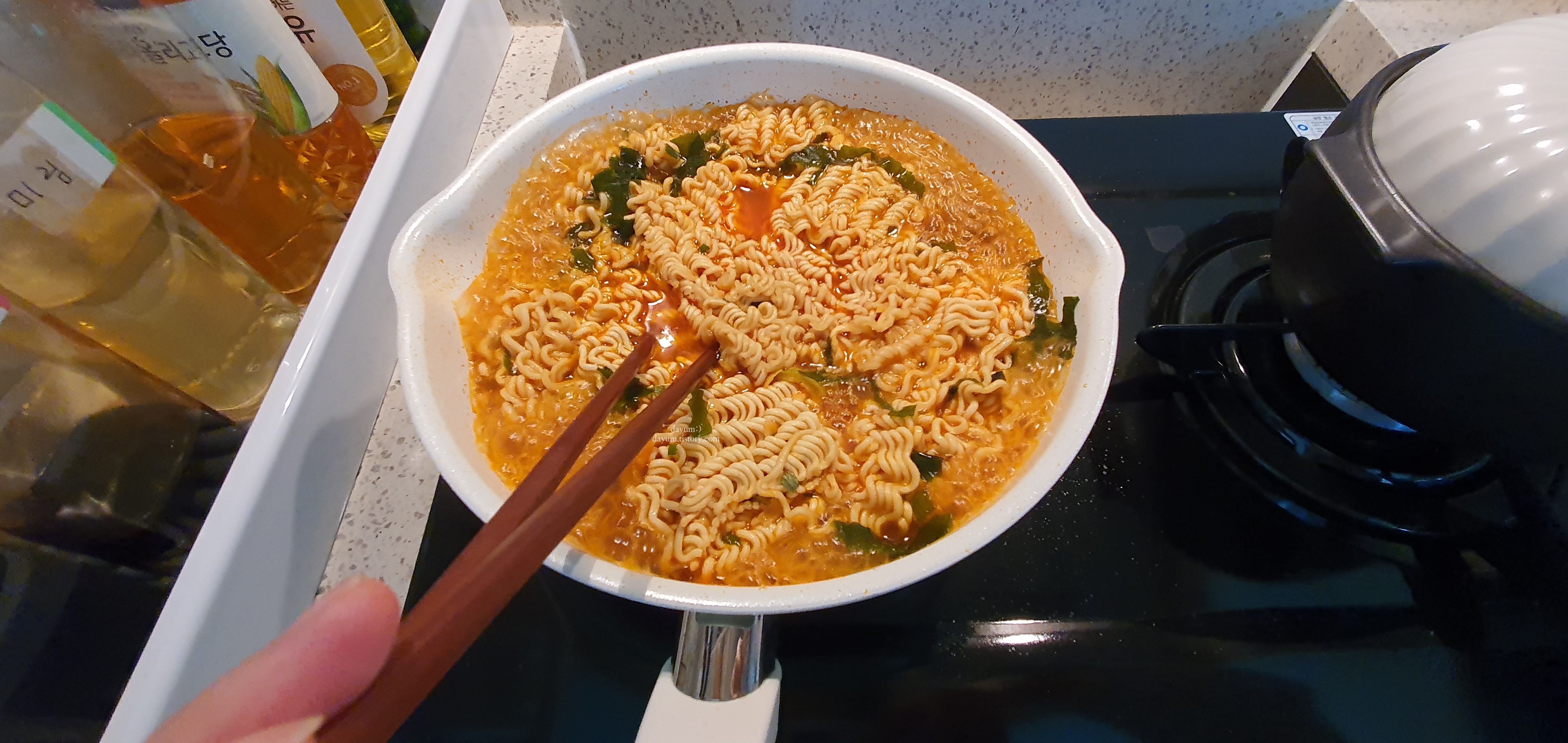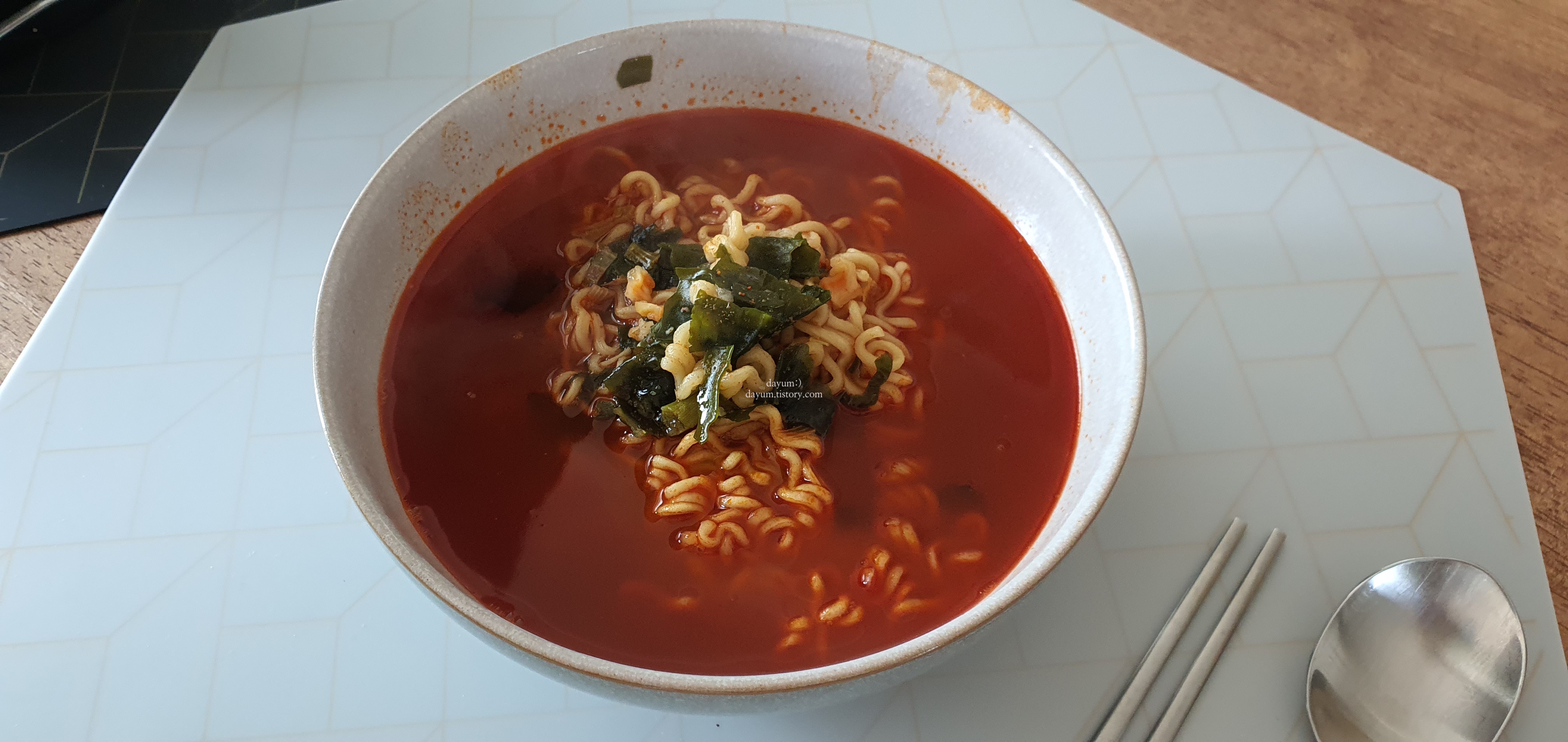 본연의 맛을 느끼고 싶어서 아무것도 안넣고 딱 라면 패키지에 있는것만 넣어서 끓였다.