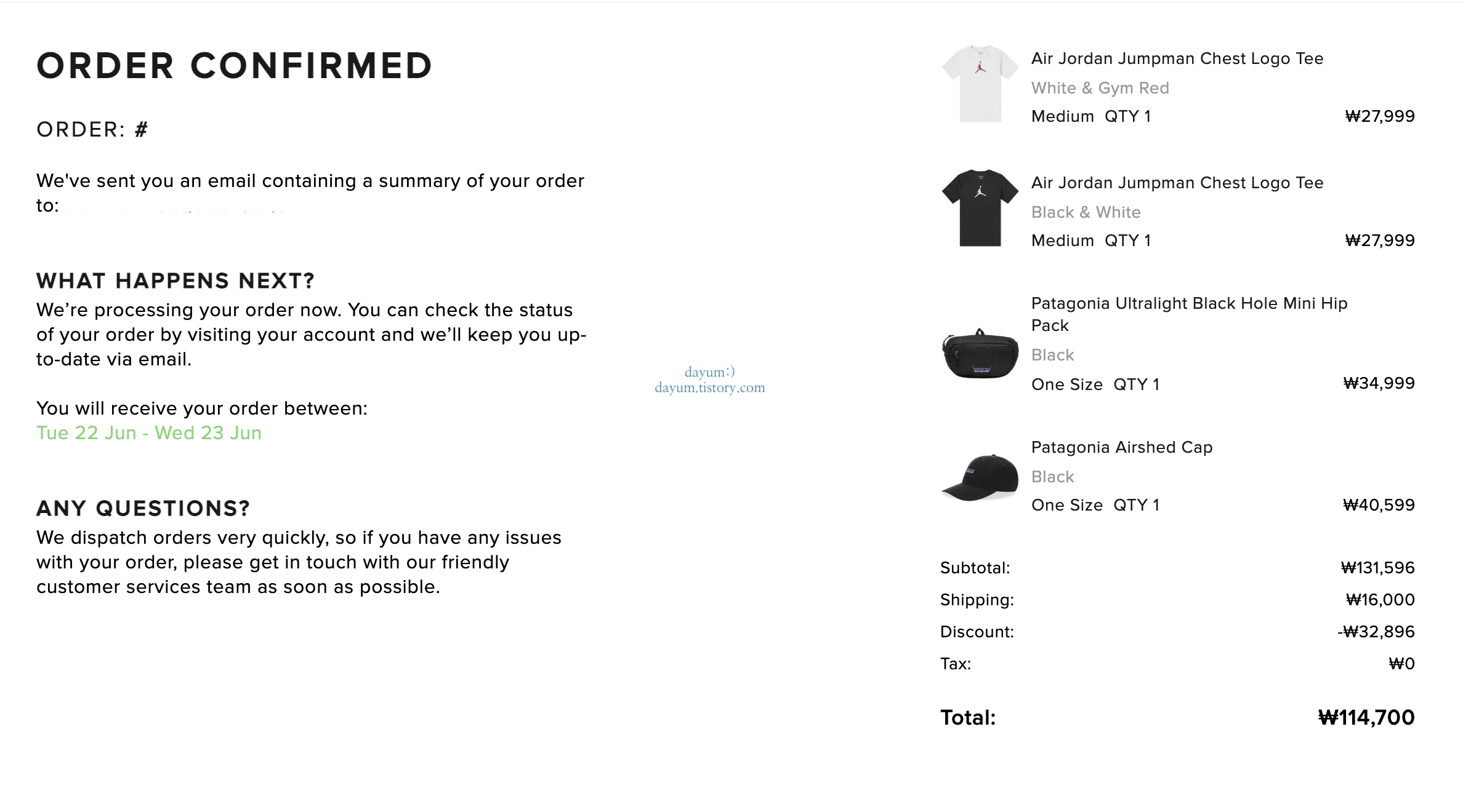 06.18 주문한 티셔츠와 힙색, 모자가 06.29 도착했다. 엔드클로딩이 배송이 빨랐는데 이번엔 진짜 너무 늦었다. 배송 예상일이 06.22-23였는데 24일에 쉽 되었다. 페덱스로 한국에 도착했지만 여긴 지