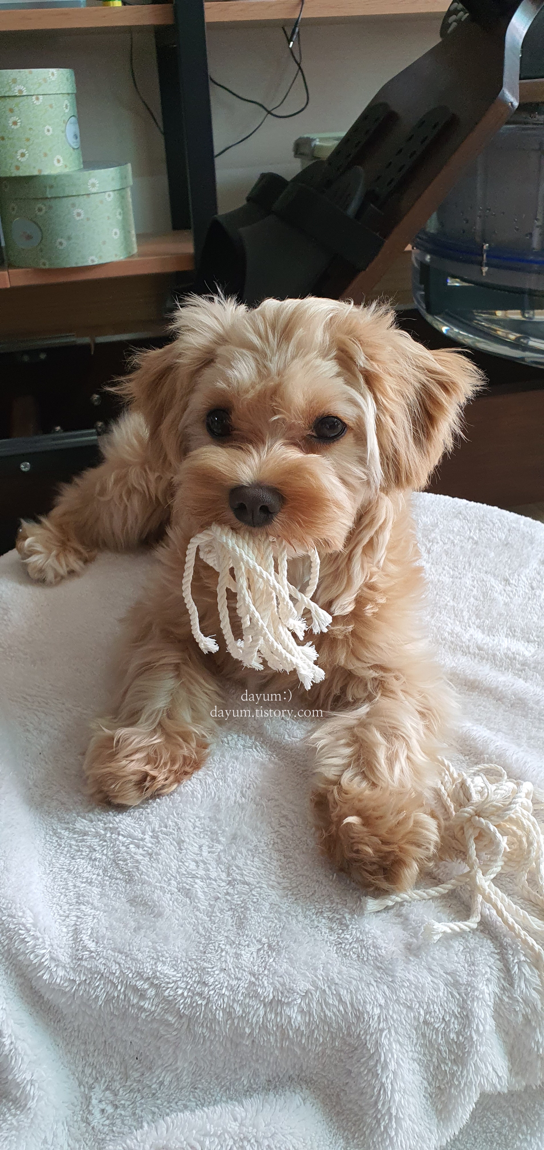 마크라메 끈으로 만들어준 터그놀이 장난감, 하루만에 아작냈죠 -
