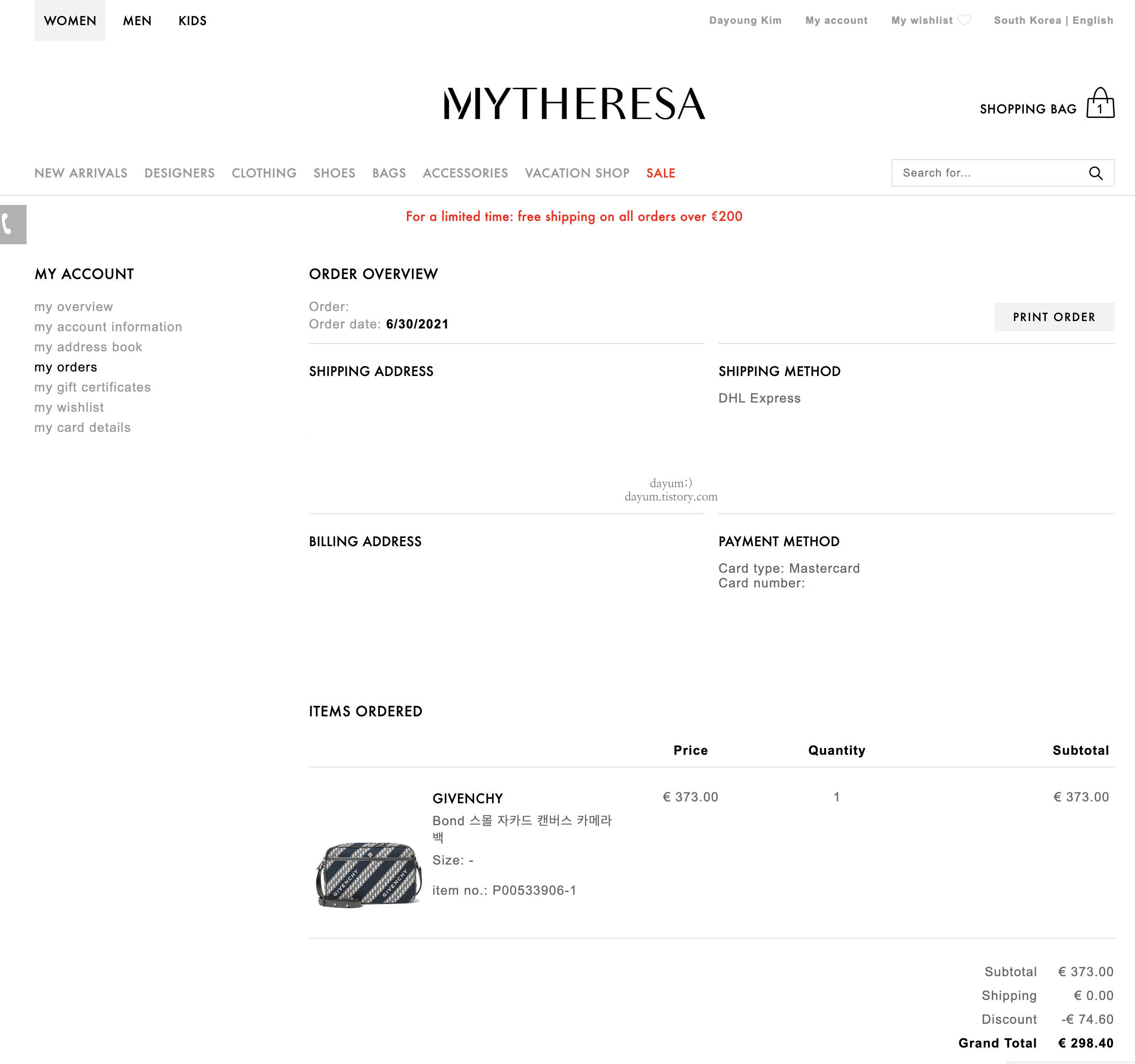 GIVENCHY Bond Small jacquard canvas camera bag 06.30 오전에 주문했는데 07.03 오전에 도착했다. 배송예정일은 7월 6일이었는데 구매한 날 발송되어 토요일 오전에 받을 수 있었다. https://dayum.tistory.co..