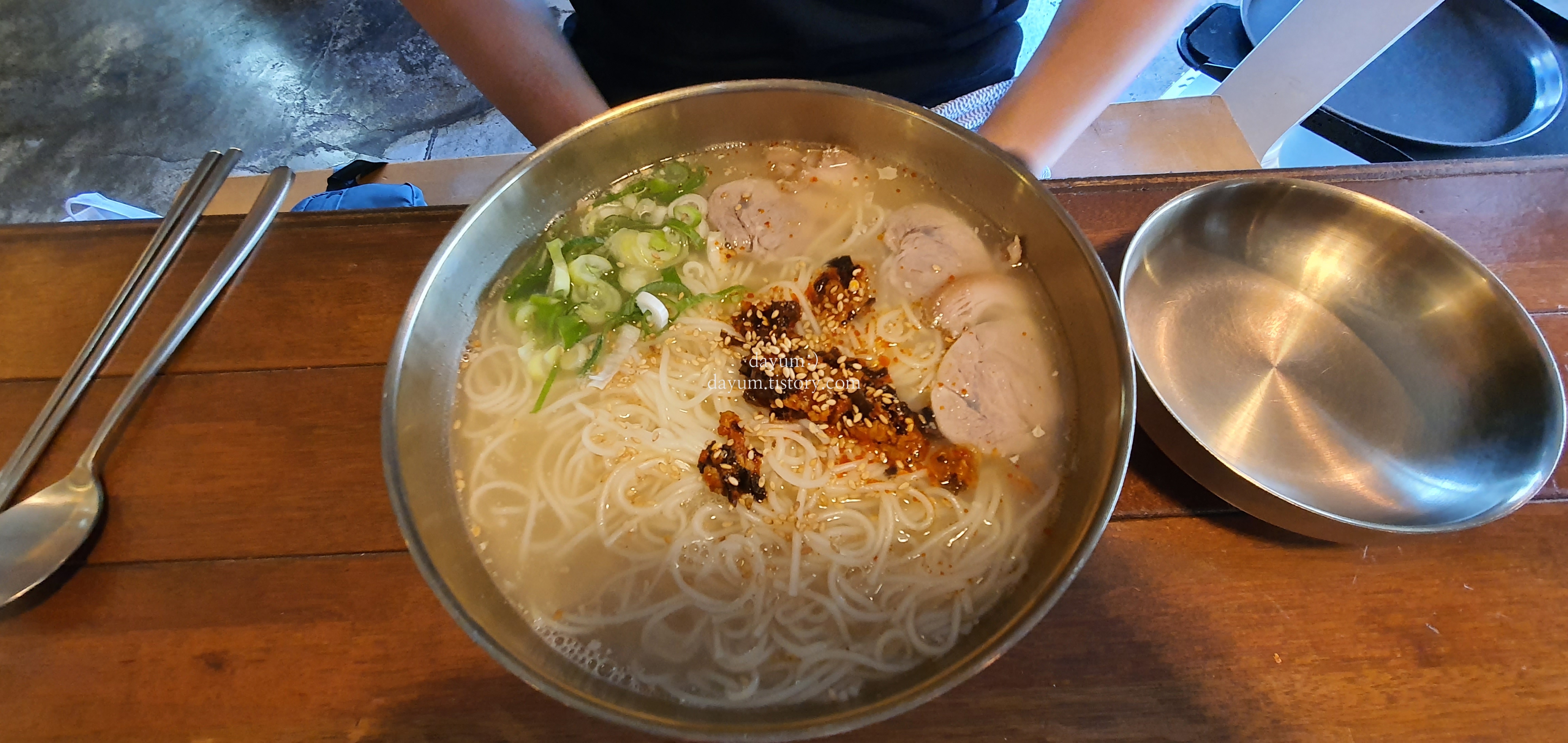 여긴 가벼운 스타일인가보다. 약간 맑은 육수인데 닭곰탕 느낌이었다.