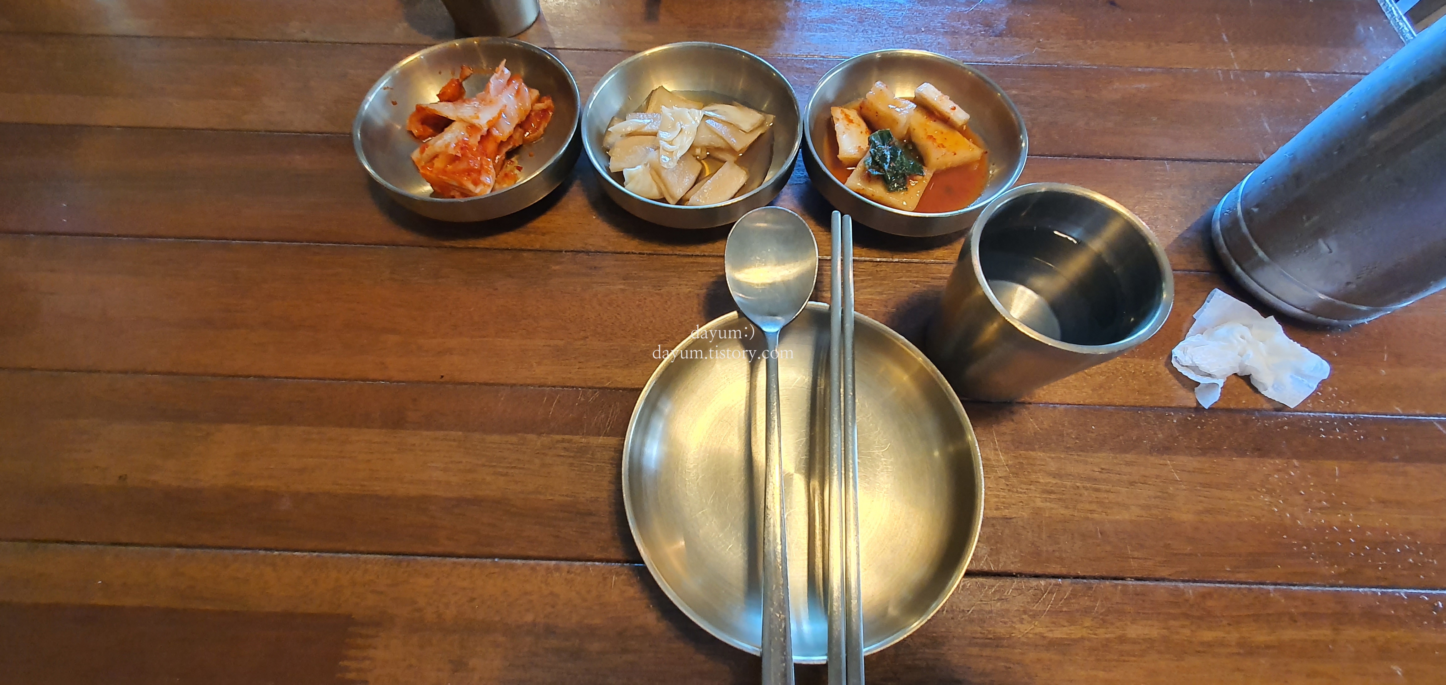 기본 반찬을 가져다준 로봇, 가운데에 양배추무피클?절임? 맛있다.