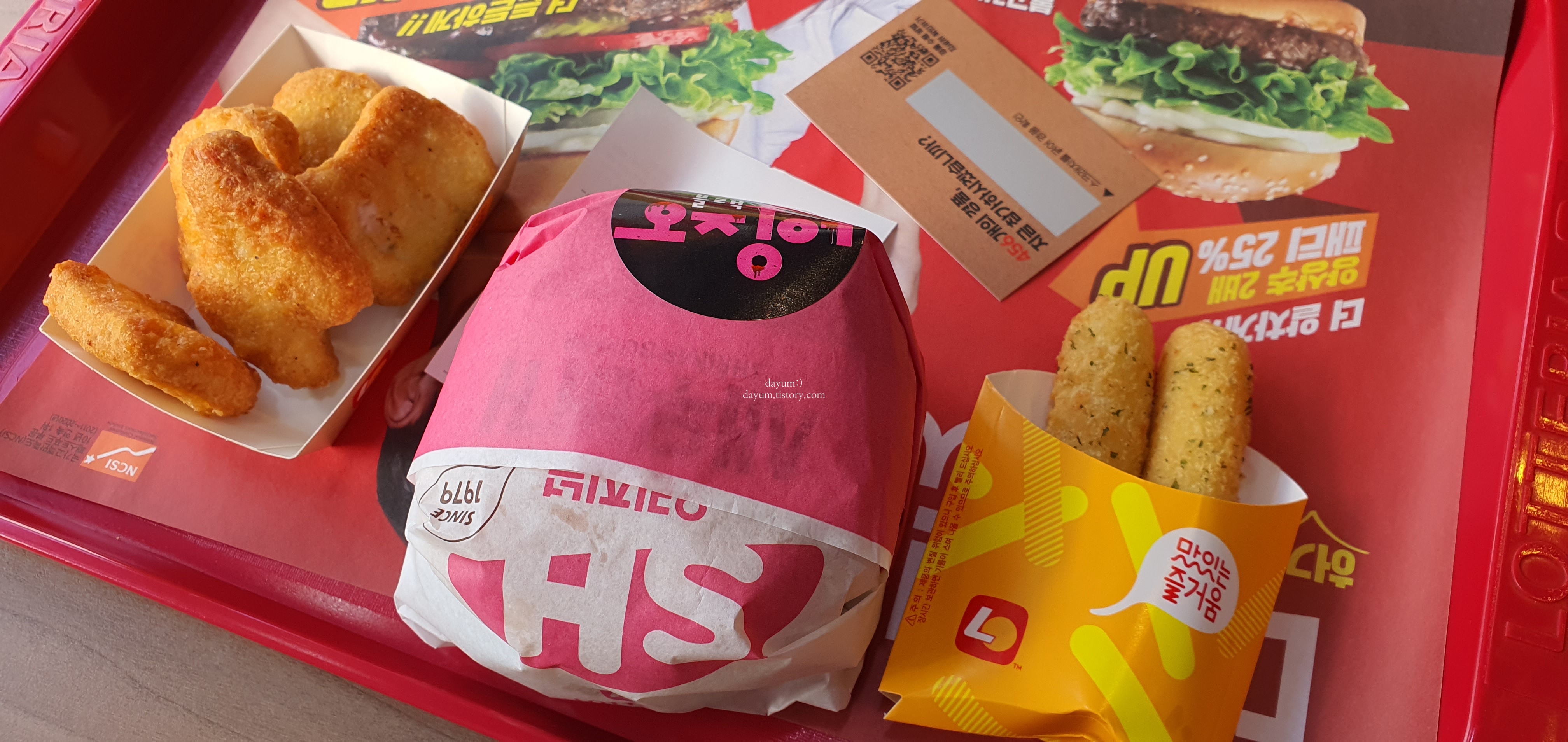 매콤한 맛이 정말 마음에 들었다. 치즈스틱과 너겟이 들어간게 싱글팩인데 감자튀김이 없어서 아쉬웠지만 맛있었다.