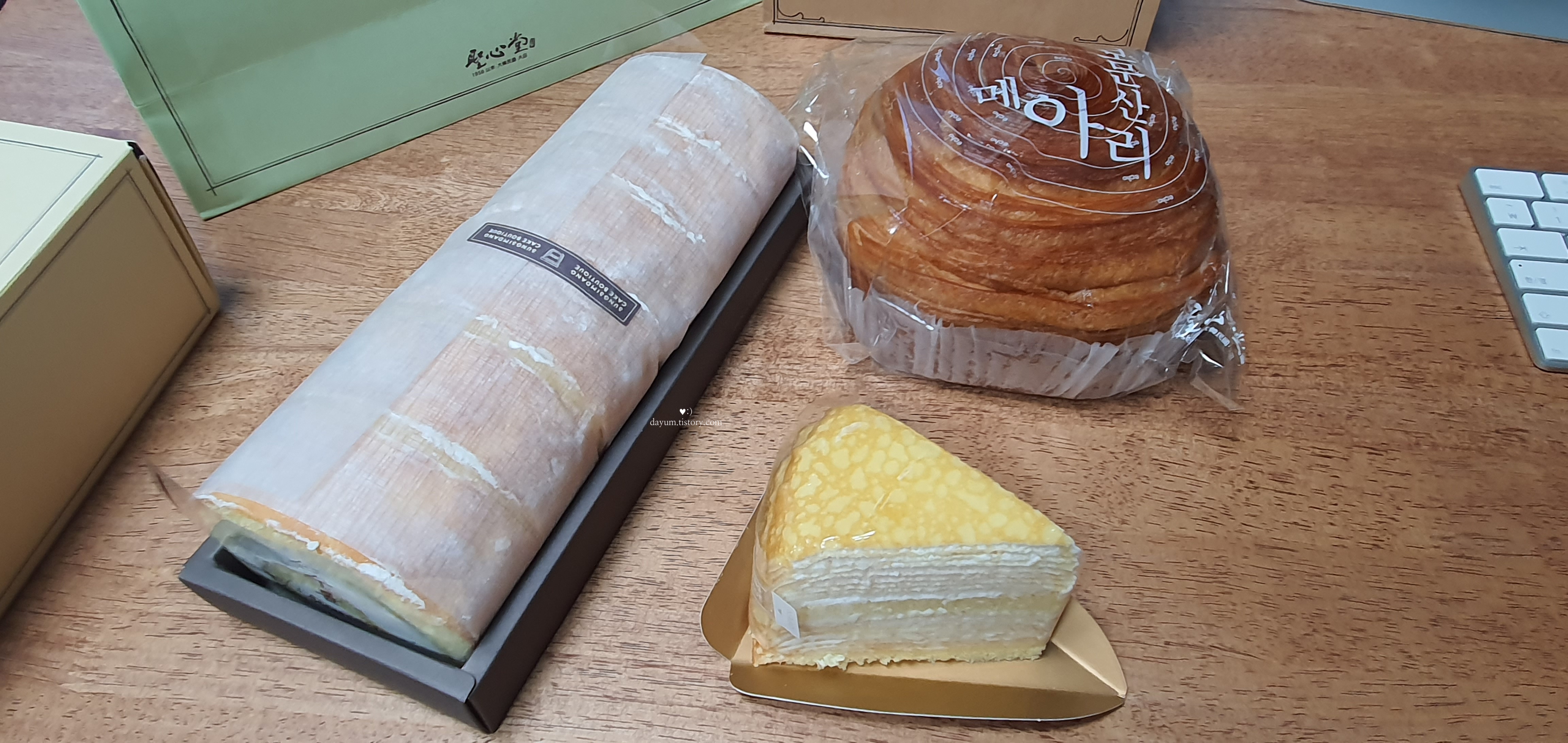 보문산메아리(5,000원)와 순수롤케이크(12,000원), 15겹크레페 조각 케이크(4,500원)를 샀다.