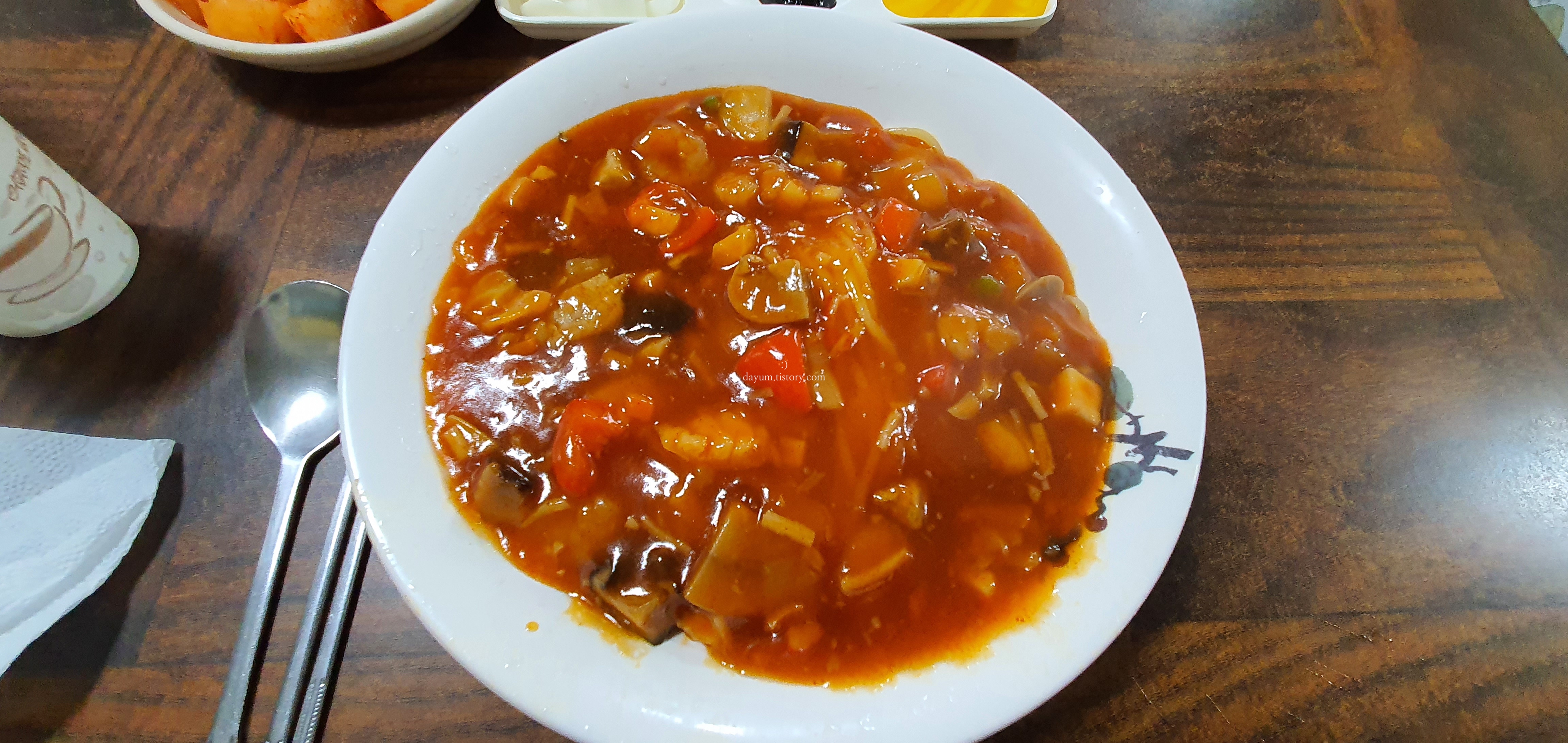 물짜장이 도대체 뭔지 궁금했는데 약간 마파두부 느낌이었고 전분기가 있는 소스였다. 빨간색에 비해서 맵지는 않았다. 일반 자장면과는 많이 다른 맛이었다.