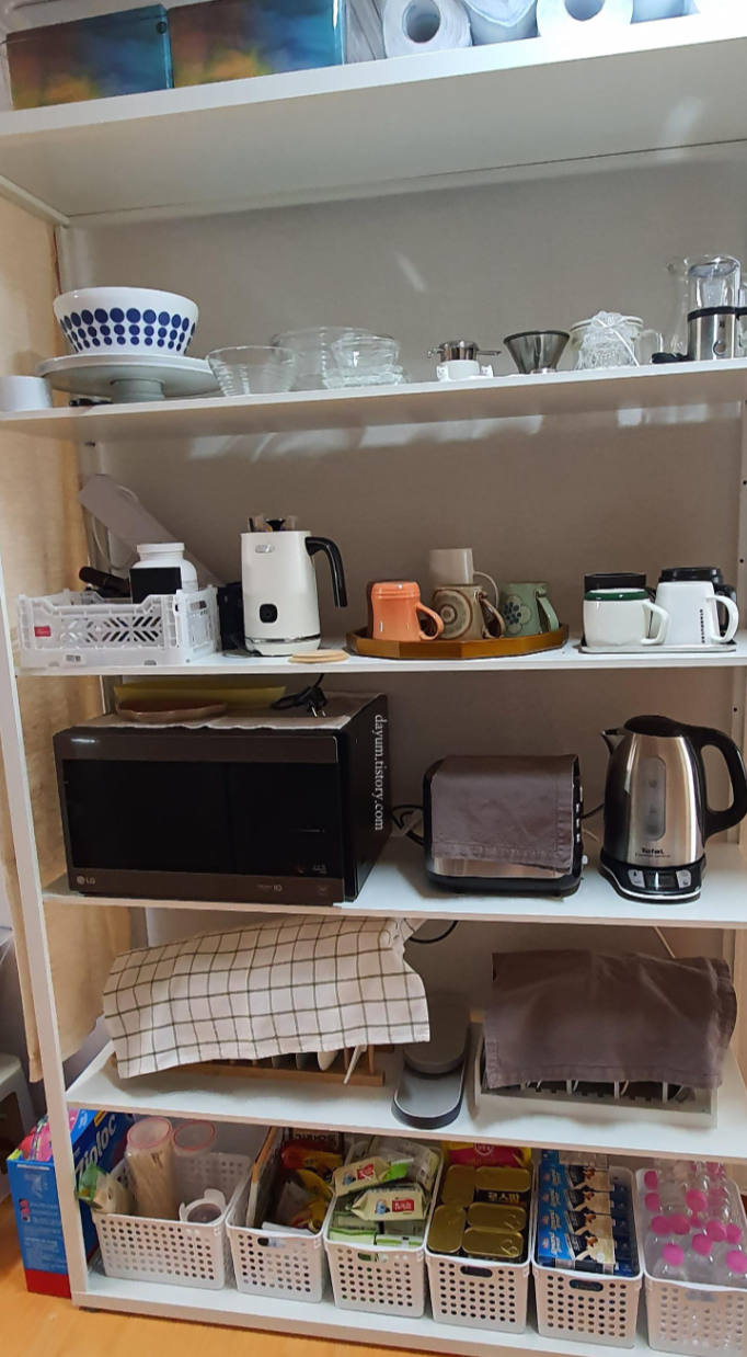 선반을 하나 더 구입할 예정인데 선반이 도착하면 전자레인지는 옮겨질거다.