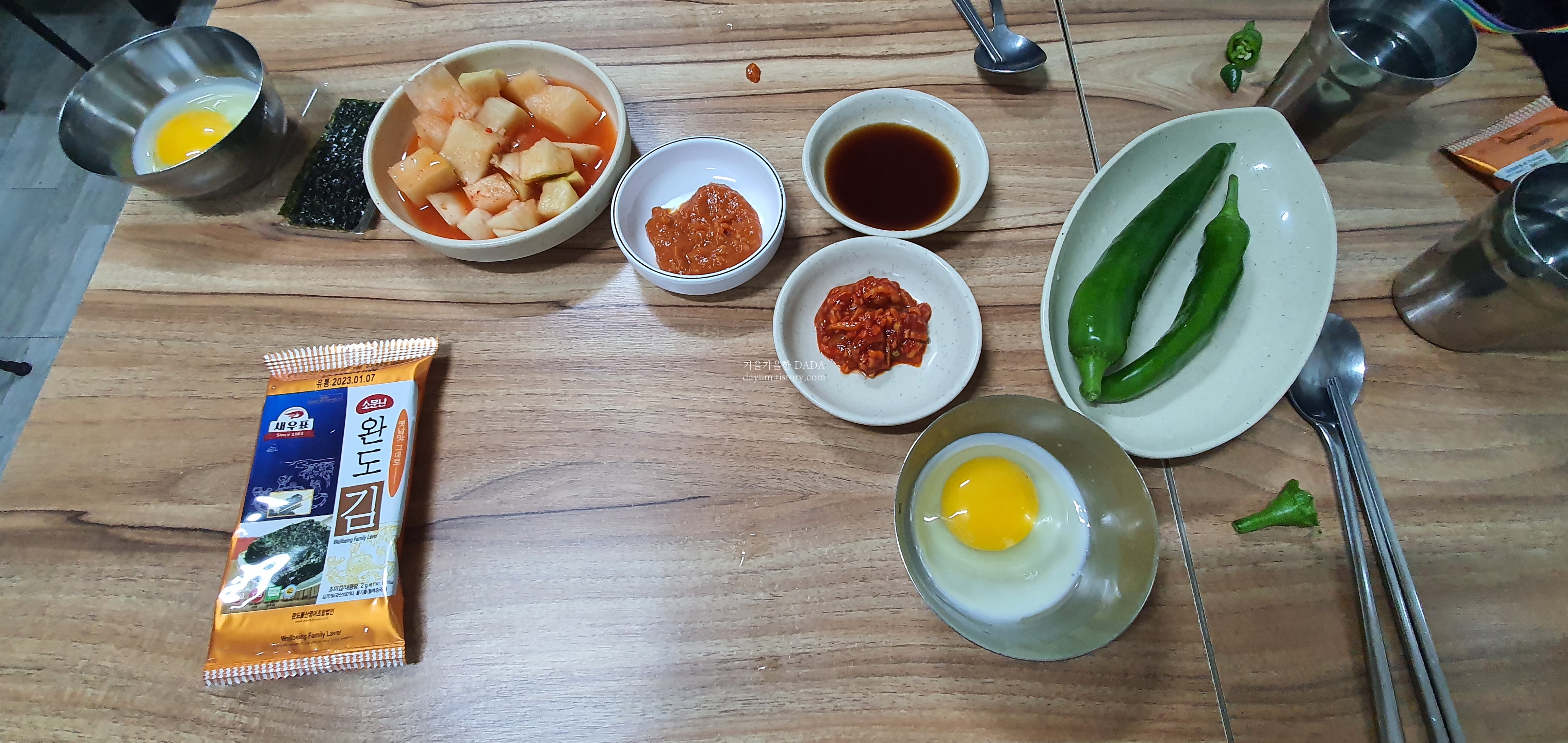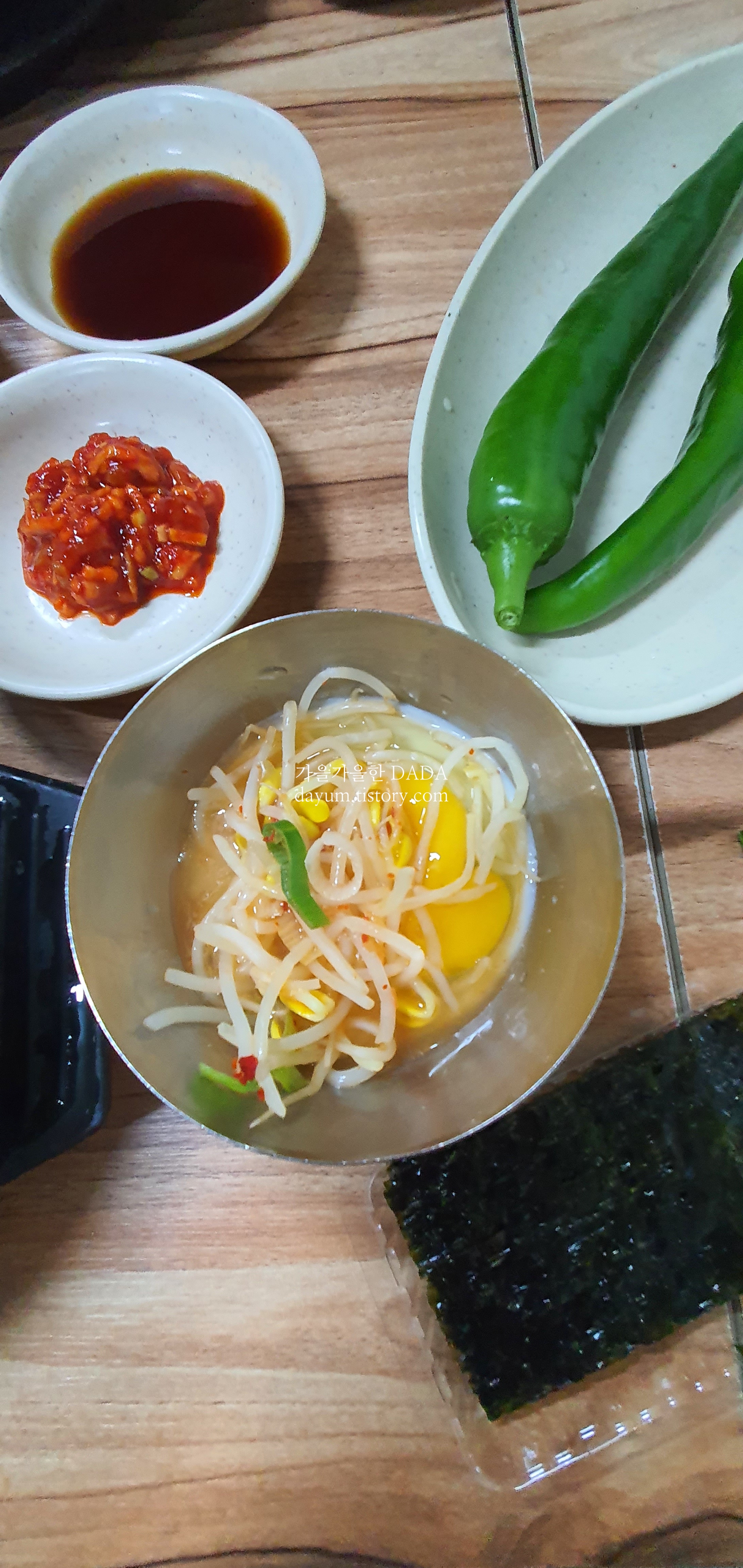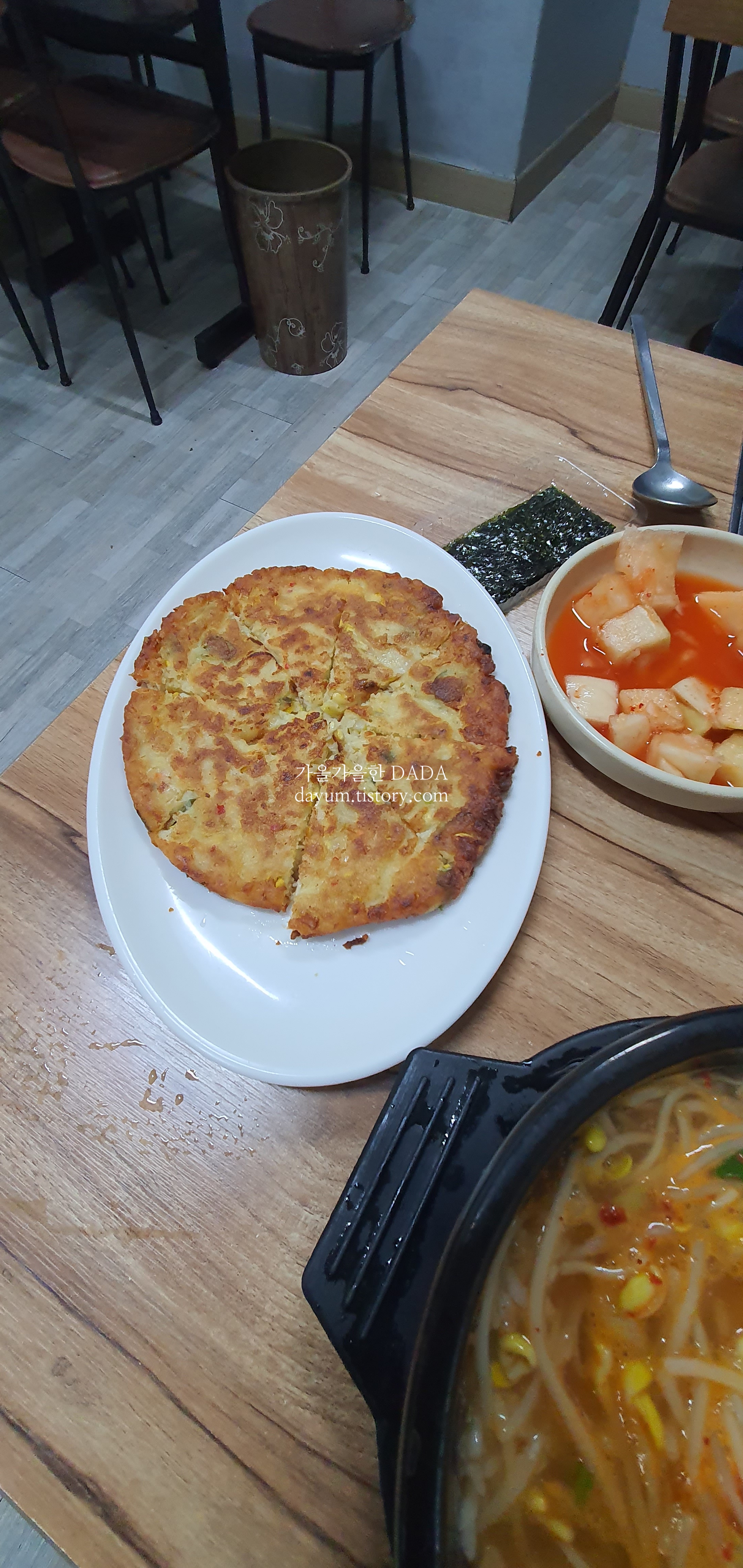 골목식당에서 본 대로 수란에 콩나물을 넣어서 김에 싸먹고 있으니까 녹두전도 나왔다.