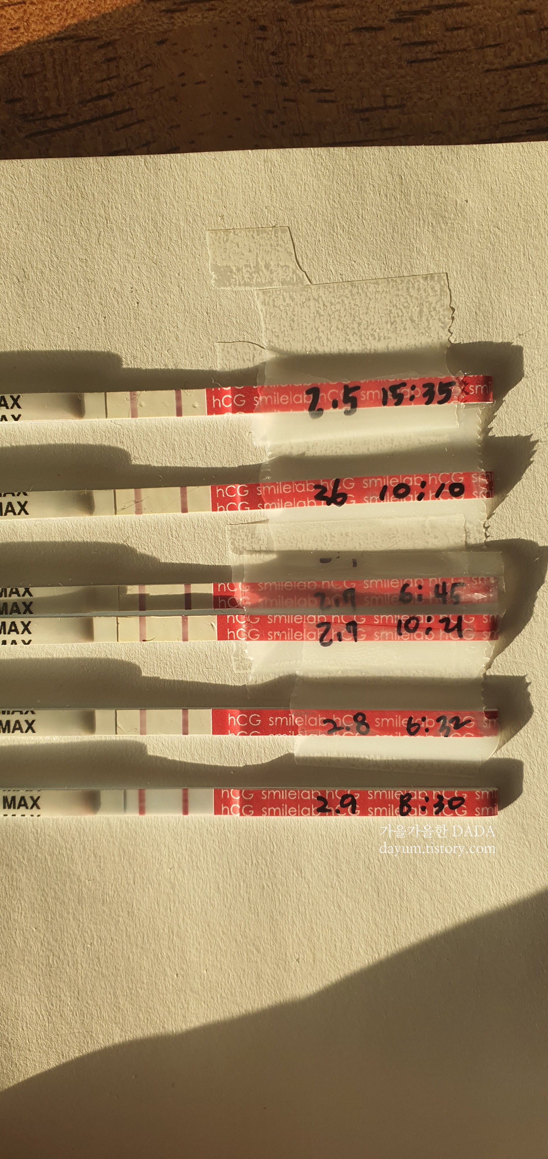 이틀에 한 번씩 테스트 해서 진해지는게 보이면 정상임신이라고 하길래 마음 졸이면서 기다렸다.