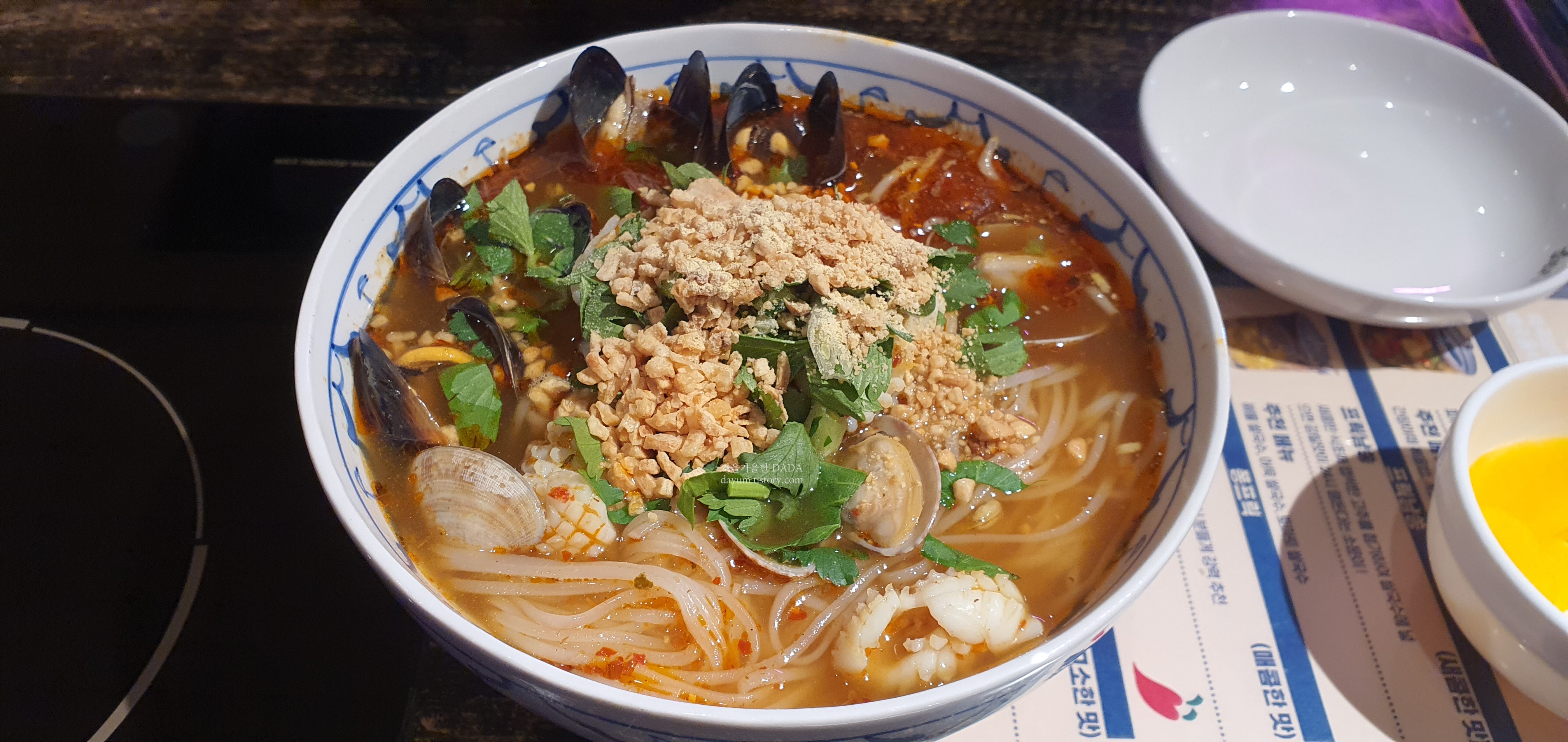 마산 신세계 백화점의 콘타이. 오늘은 새로운 메뉴에 도전했다. 얌운센 yam woon sen 12000원 새콤한? 맛을 좋아하는 나에겐 이것도 정말 맛있었다. 똠얌쌀국수를 남편에게 잠시 양보하고 퍼묵퍼묵