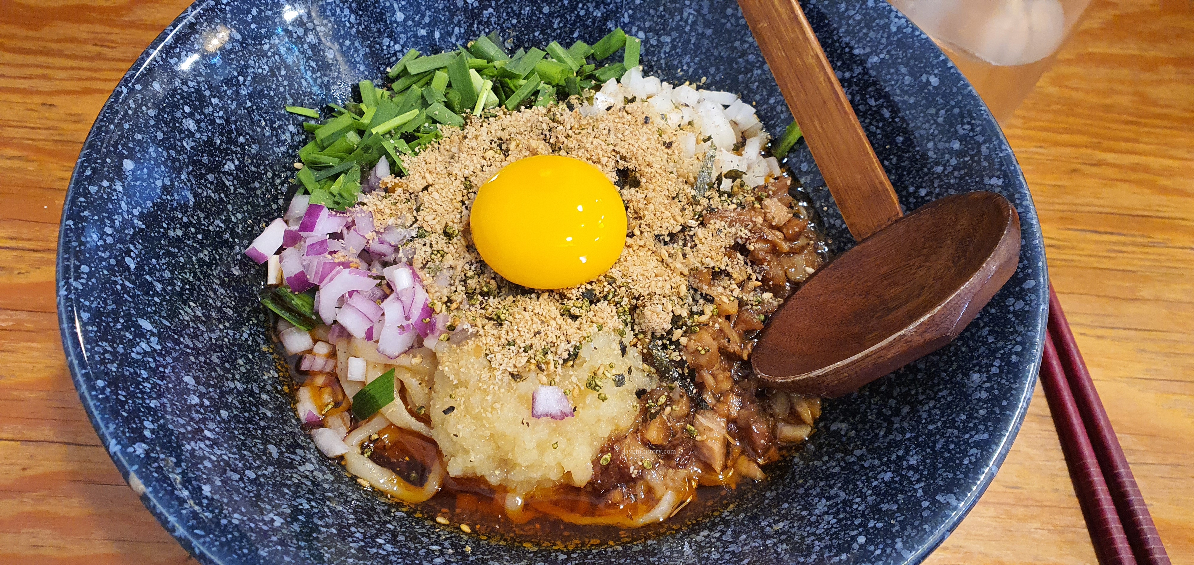 밥을 요청하면 밥아래에 소스가 있고 위에는 잘게 다져진 단무지가 올려진 밥이 나오는데 면만 건져 먹고 고명이 남은 마제멘에 넣어서 비벼 먹으면 된다.