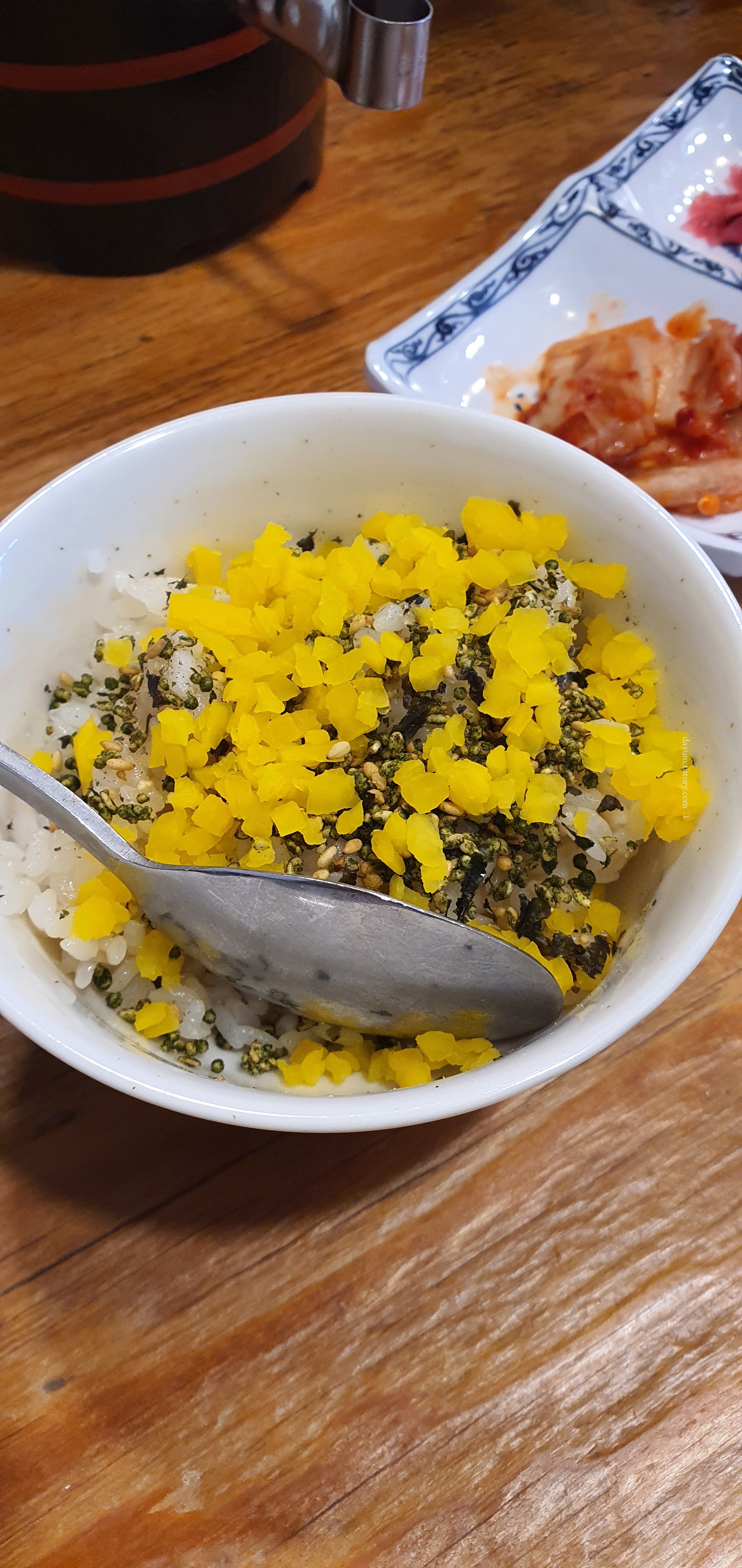 노른자를 터트려서 잘 비벼 먹으면 되는데, 나는 다시마식초를 뿌려서 먹었다.