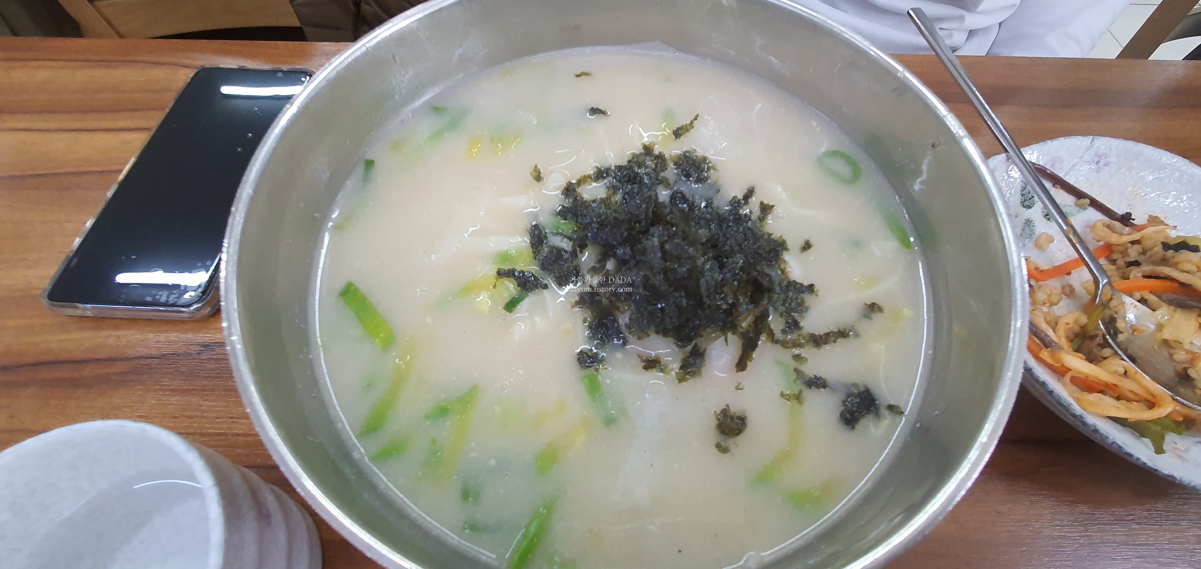 칼국수는 안에 김치만두가 한개 들어있고 국물은 사골육수라서 밥 말아 먹기에도 좋을 것 같다.