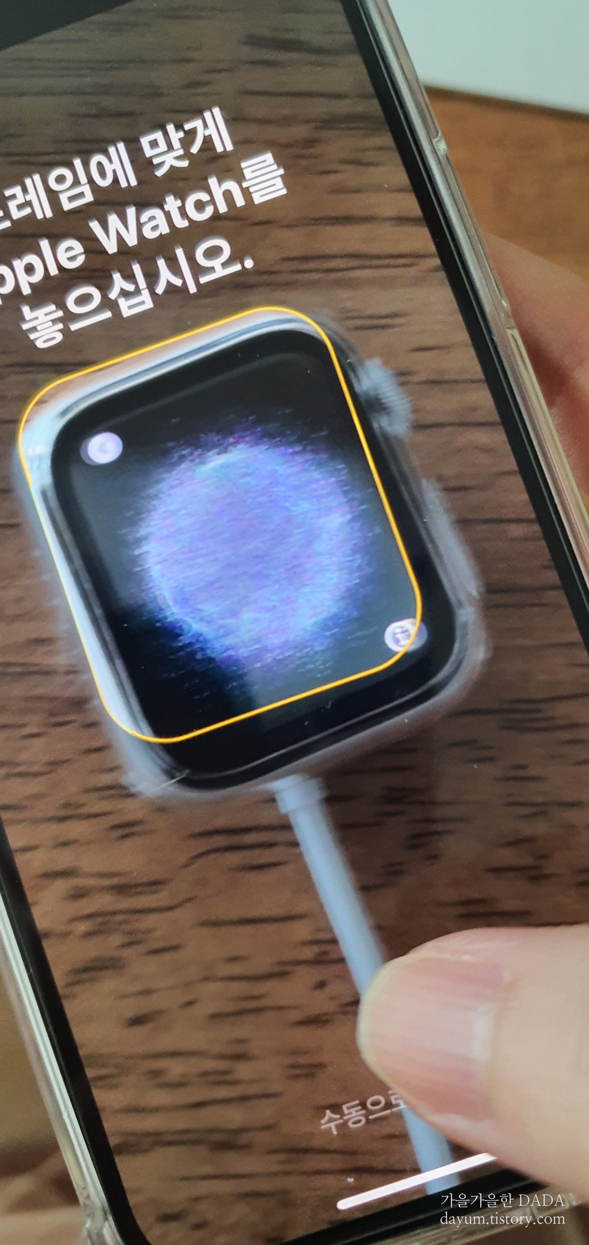 워치를 켜고 언어와 나라 설정을 하면 워치에 흐릿한 둥근 모양이 뜨는게 그걸 스마트폰 화면에 잘 맞추면 페어링이 된다.