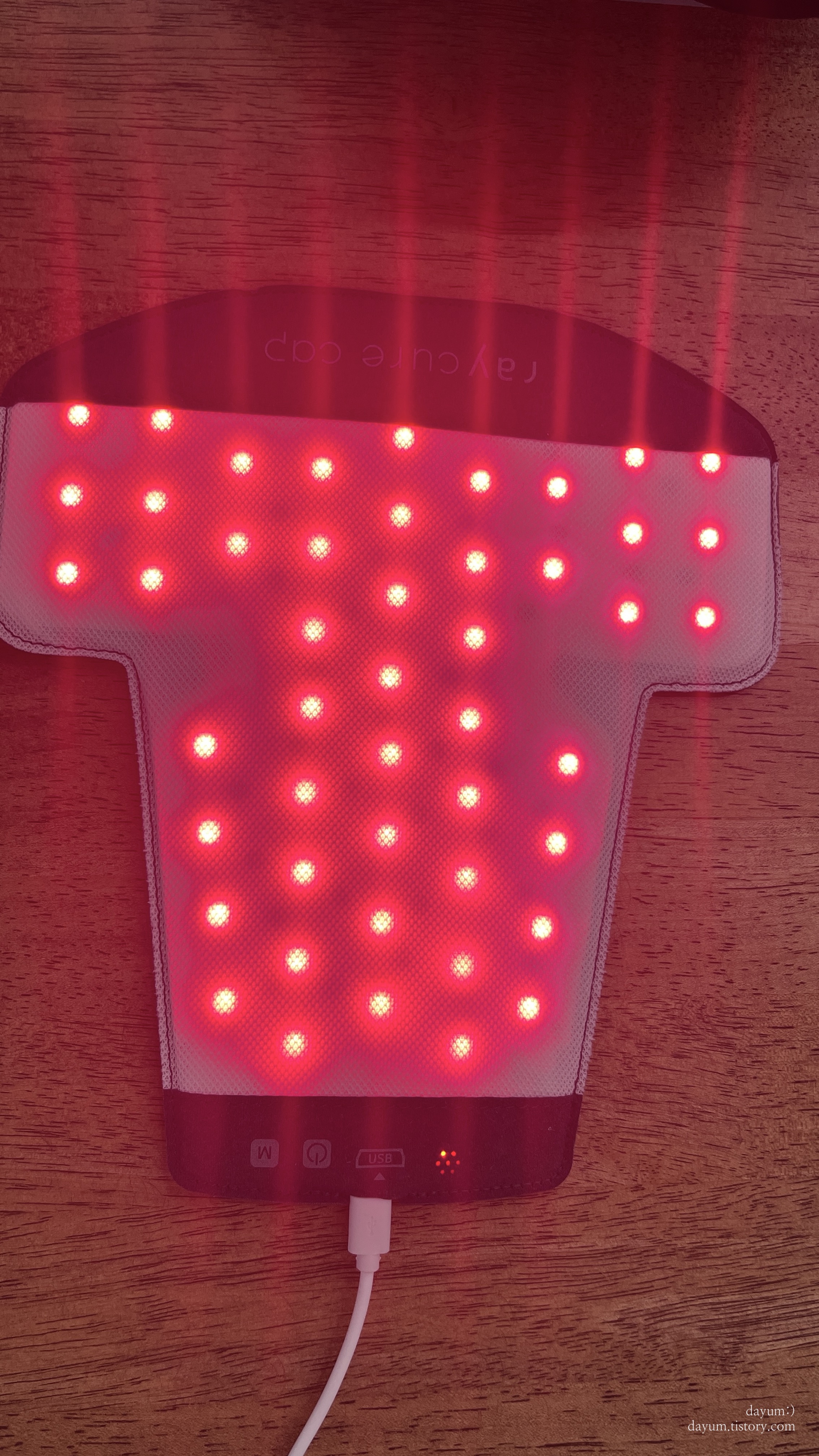 탈모치료모드는 빨간불이 계속 들어오고, 두피케어모드는 빨간불 - 약한 빨간불 - 파란불이 번걸아 나온다.