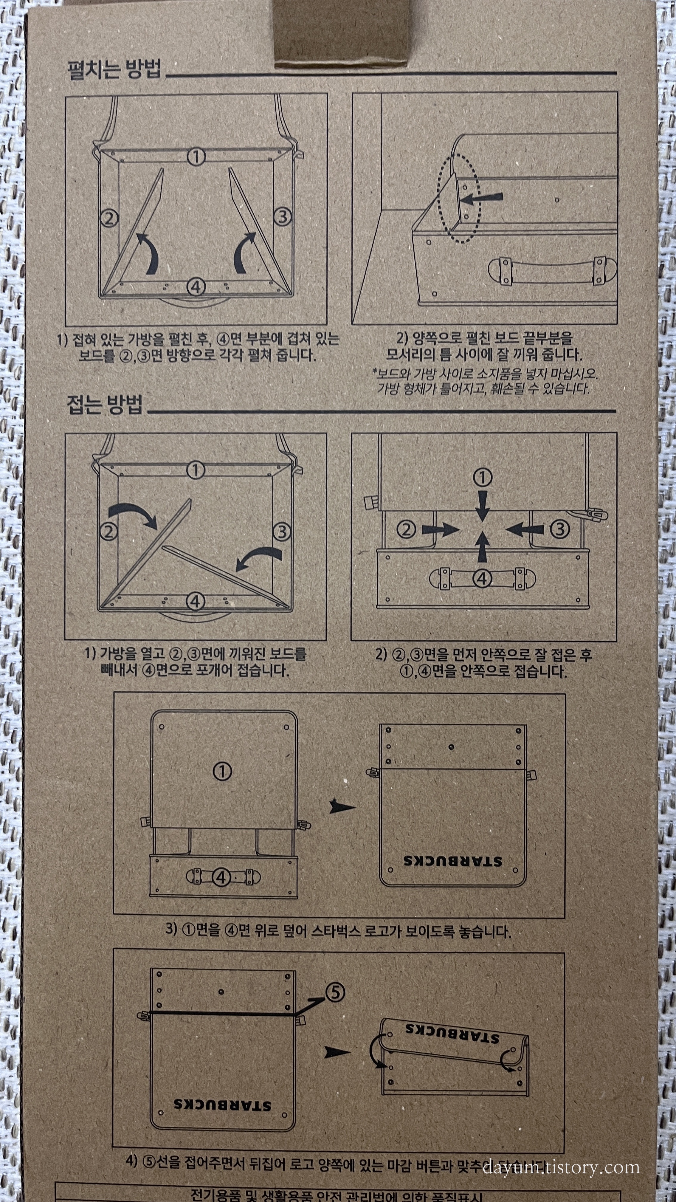 비닐에서 꺼내서 똑딱이를 떼어 펼치고 안에 있는 보드를 펼쳐 지퍼를 닫으면 끝이다.