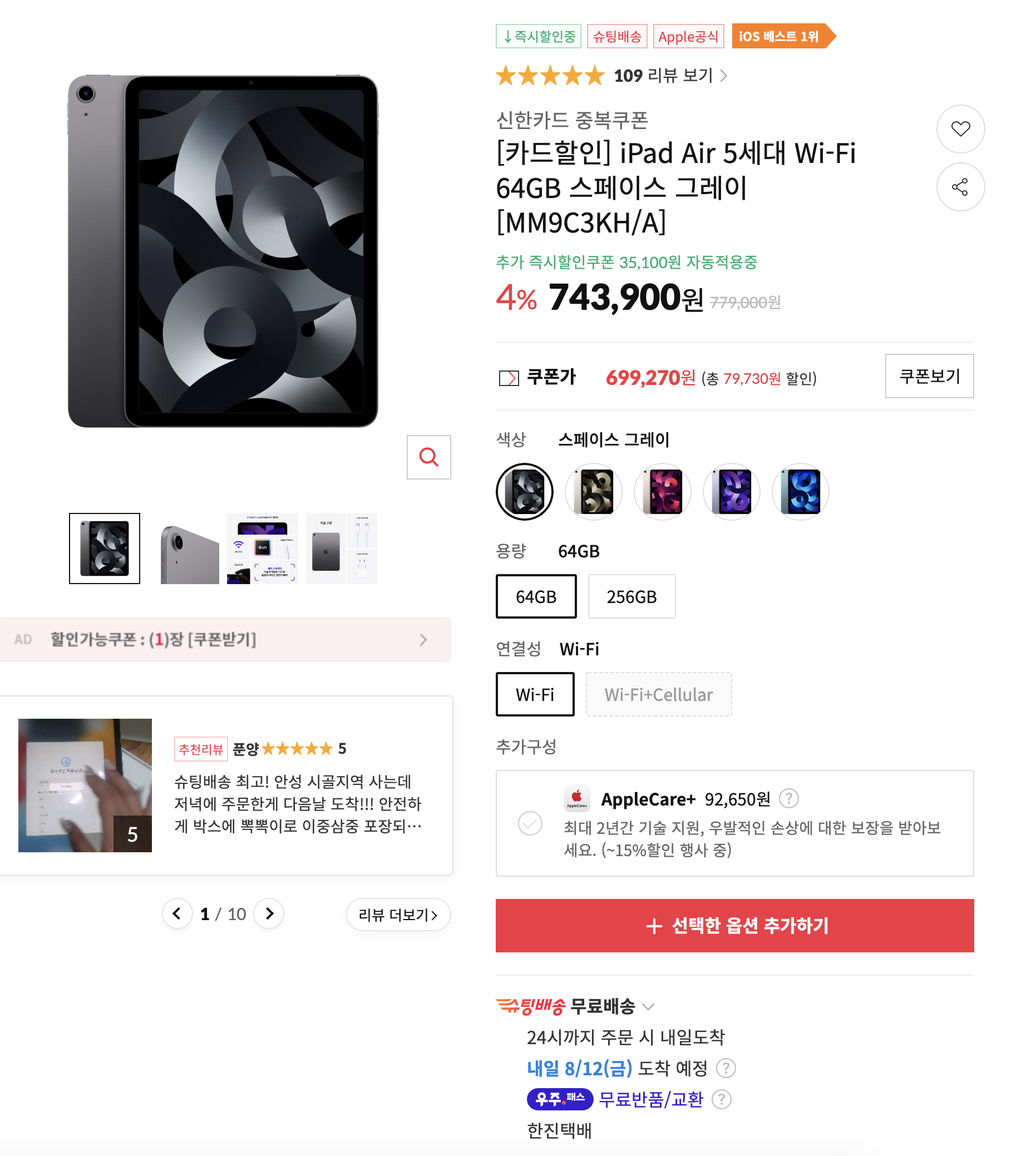 어제까지만해도 스타라이트 색상만 추가세일을 했는데 오늘 11번가 십일절에 모든 색상이 할인을 해서 바로 결제했다.