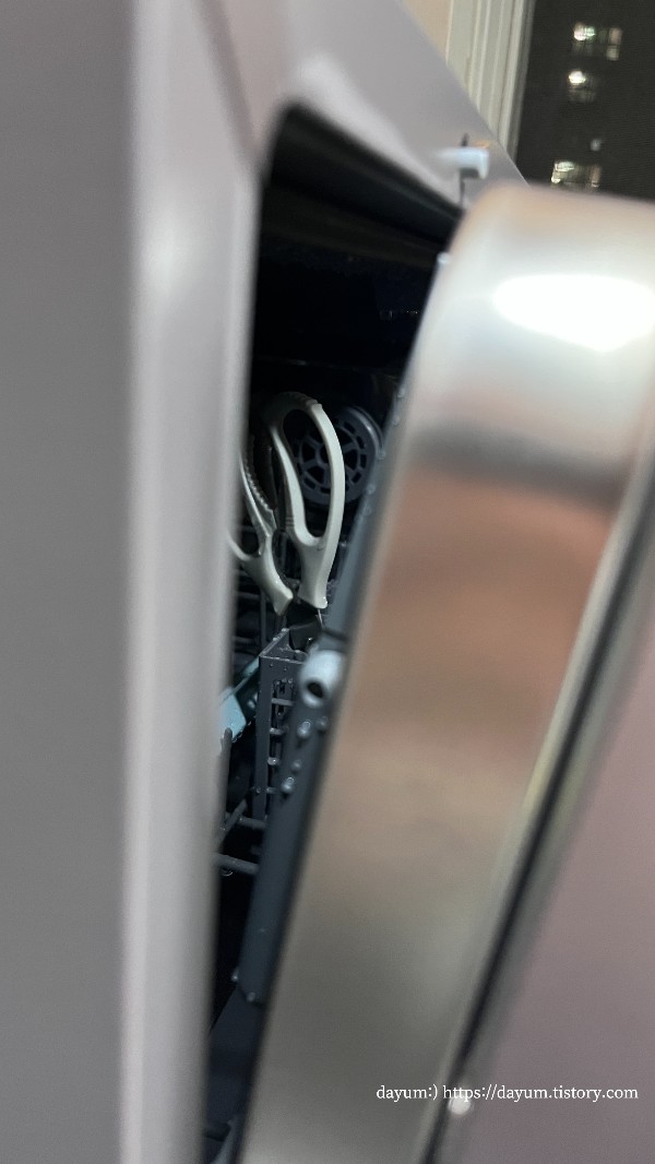 물 설거지가 끝나면 건조를 위해 자동으로 문이 열리고 이 상태에서 팬이 돌아간다.