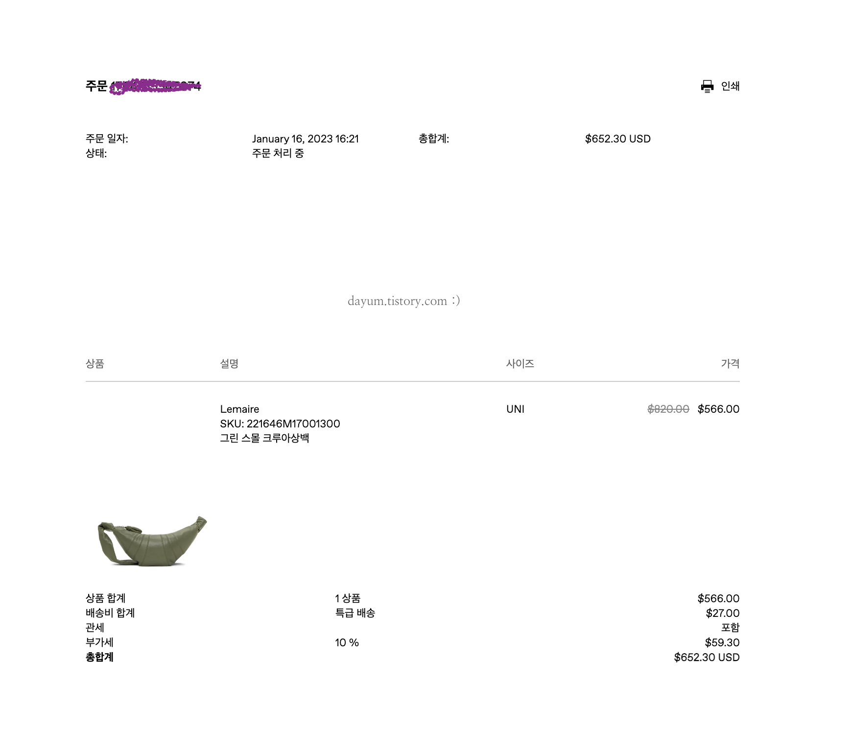 센스 직구, 반품 후기(르메르 범백 / 크루아상백 스몰 불량 당첨)